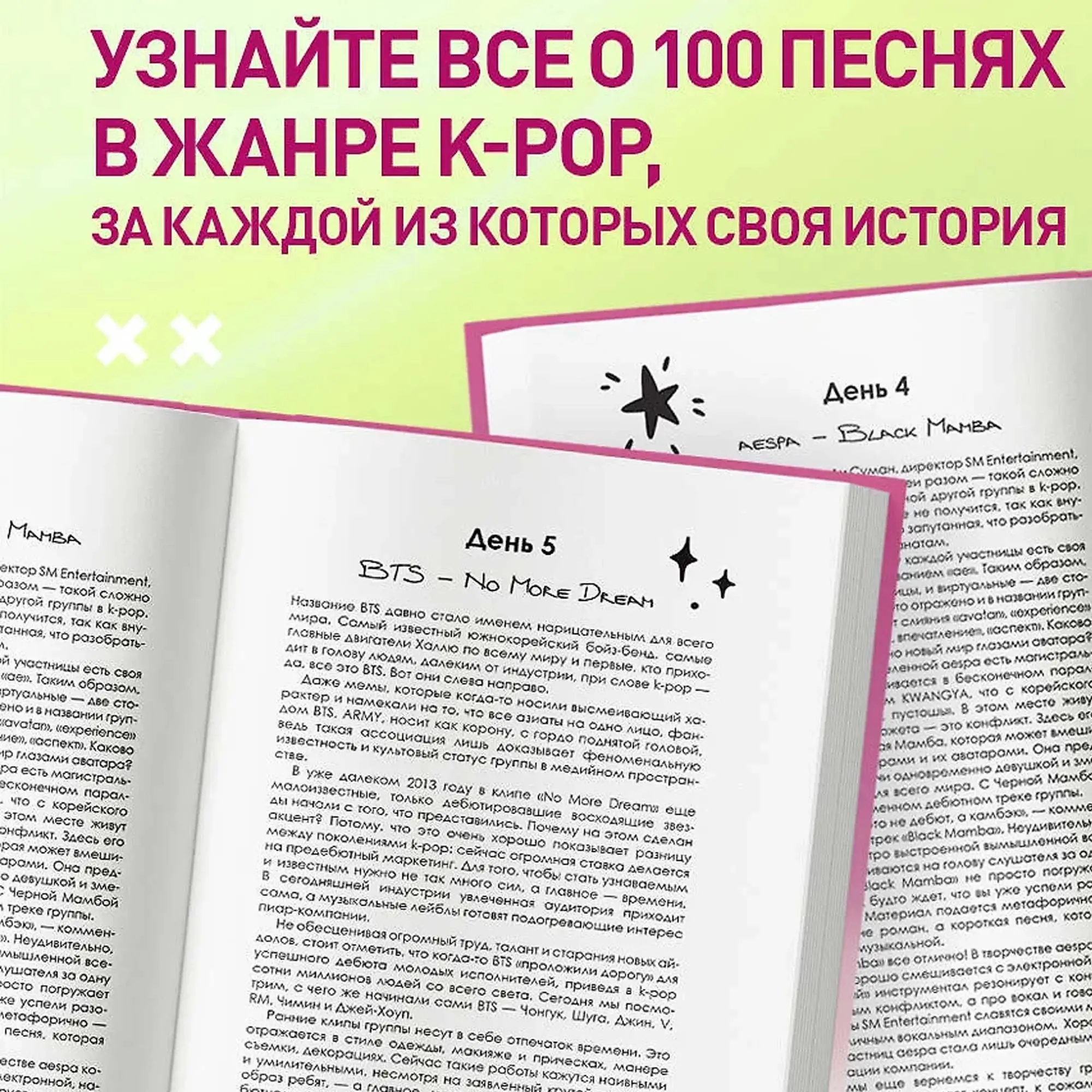 Окунитесь в удивительный и самобытный мир K-pop групп! BTS, Stray kids, BLACKPINK — эти и многие другие коллективы подарили своим фанатам не одну легендарную композицию. В книге рассказывается о 100 песнях в жанре K-pop, за каждой из которых своя история. Некоторые композиции становились хитами, другие оказывались незаслуженно забыты, а некоторые прочно ассоциируются с драматическими событиями в жизни K-pop айдолов.
