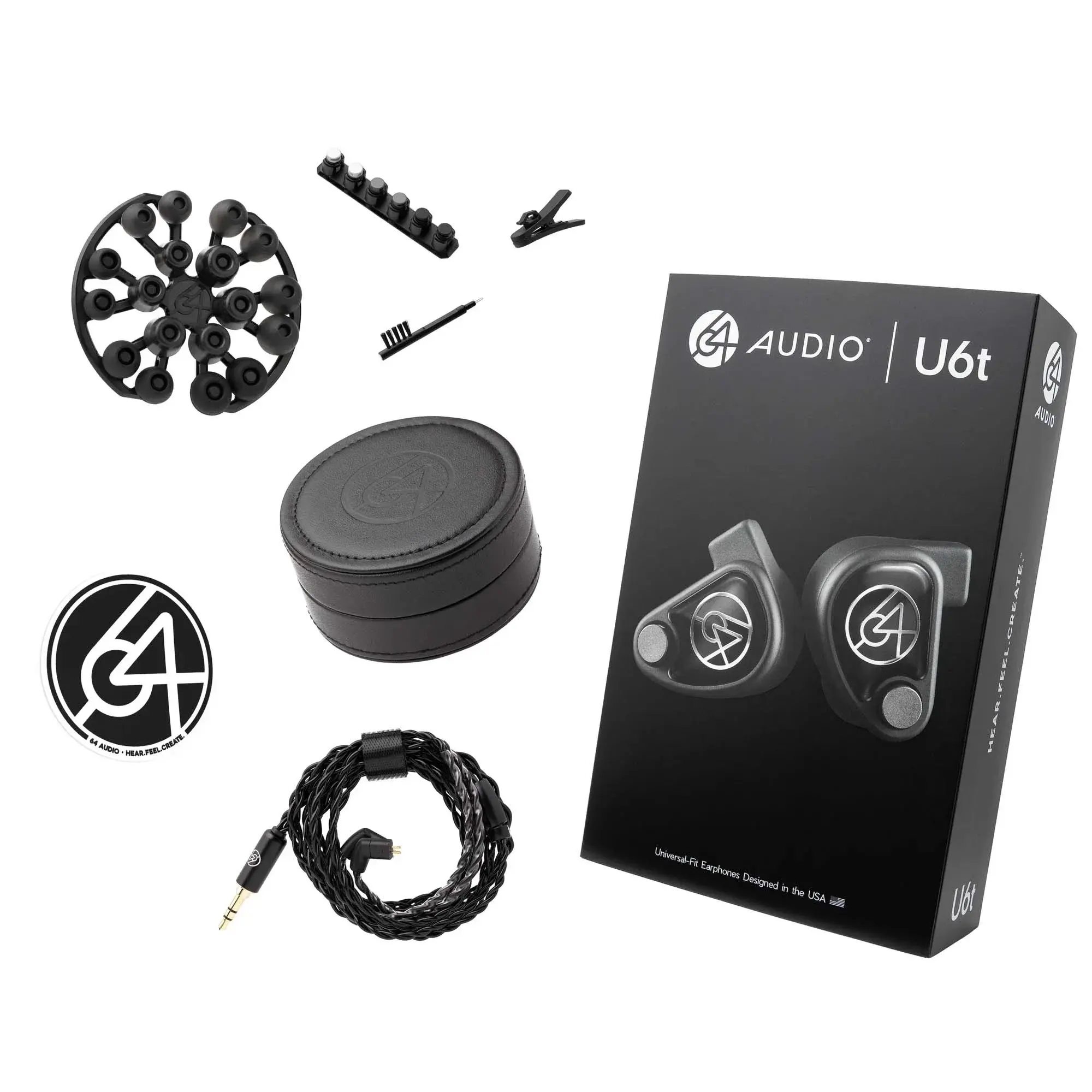 64 Audio U6t - арматурные внутриканальные мониторы. Внутри каждого монитора установлены 6 арматурных излучателей. Два сбалансированных арматурных излучателя отвечают за диапазон низких частот, два сбалансированных арматурных излучателей за середину, один tia-драйвер за переходящую середину в верха и еще один tia - за высокие частоты. За согласование излучателей отвечает 4-полосный пассивный кроссовер.