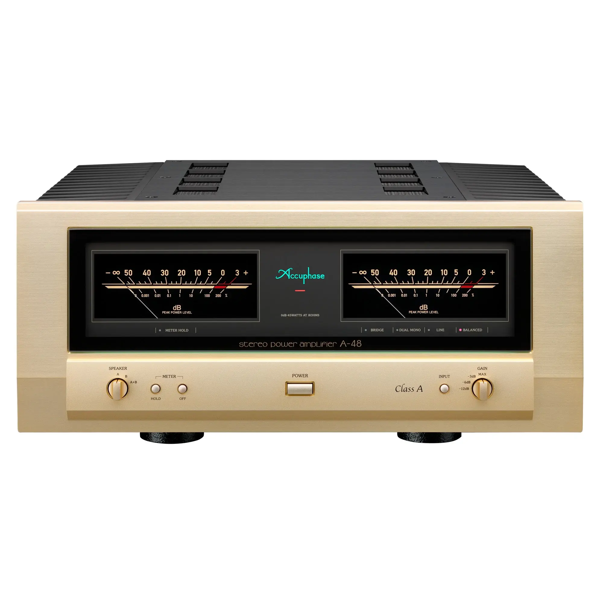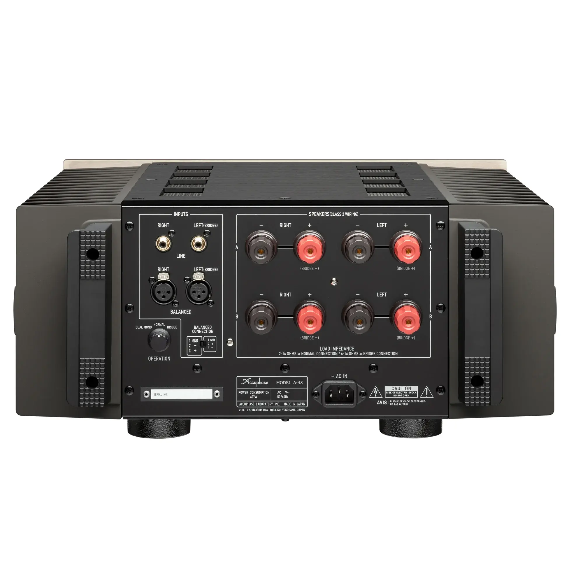 В Accuphase A-48 применена технология MCS+ и обратная связь по току, которые обеспечивают превосходное, чистое и прозрачное звучание. Массивный тороидальный экранированный трансформатор с двумя независимыми обмотками и два массивных конденсатора ёмкостью по 56000 мкф обеспечивают все цепи усилителя мощности чистым питанием. В каждом канале установлены 6 пар полевых транзисторов которые работают в двухтактном режиме и чистом классе "А" обеспечивают 45 ватт мощности при 8 ом в стереорежиме, и 180 ватт мощности в мостовом включении Accuphase A-48.