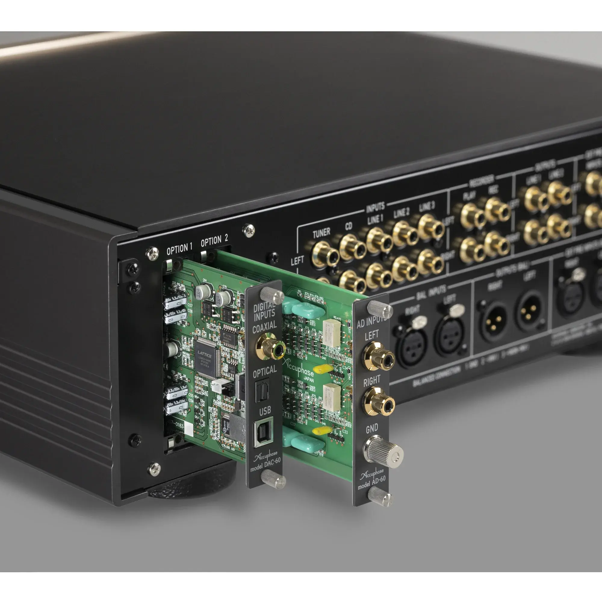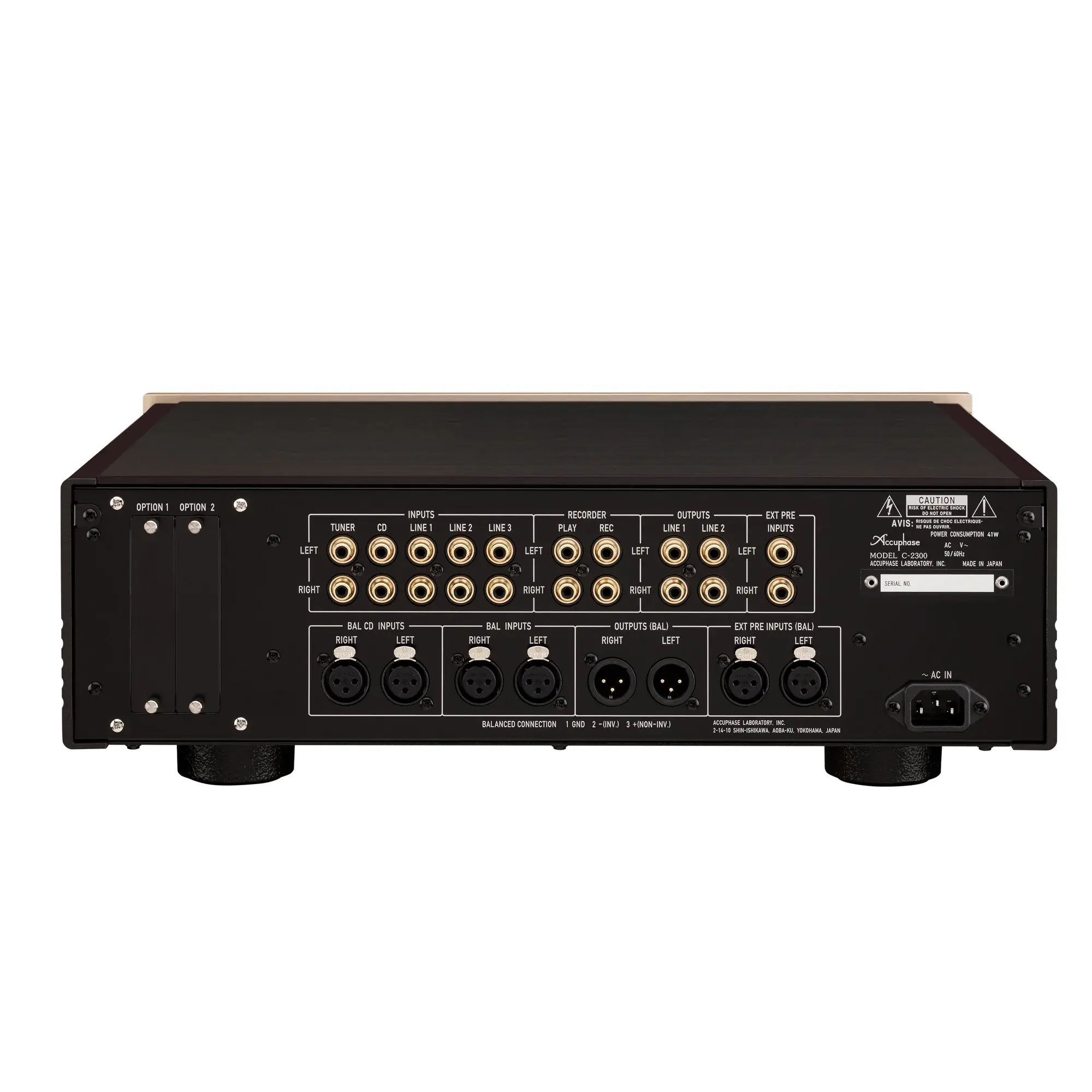 Accuphase C-2300 может быть оснащён двумя опционально устанавливаемыми платами: DAC 40 и AD 30. Встраиваемая плата DAC 40 оснащена цифро-аналоговым преобразователем MDS++ (24bit/192Khz). Она имеет: коаксиальный вход (RCA S/PDIF 75 om), оптический вход (TosLink) и вход USB 2.0. На плате AD 30 расположен ММ/МС фонокорректор.