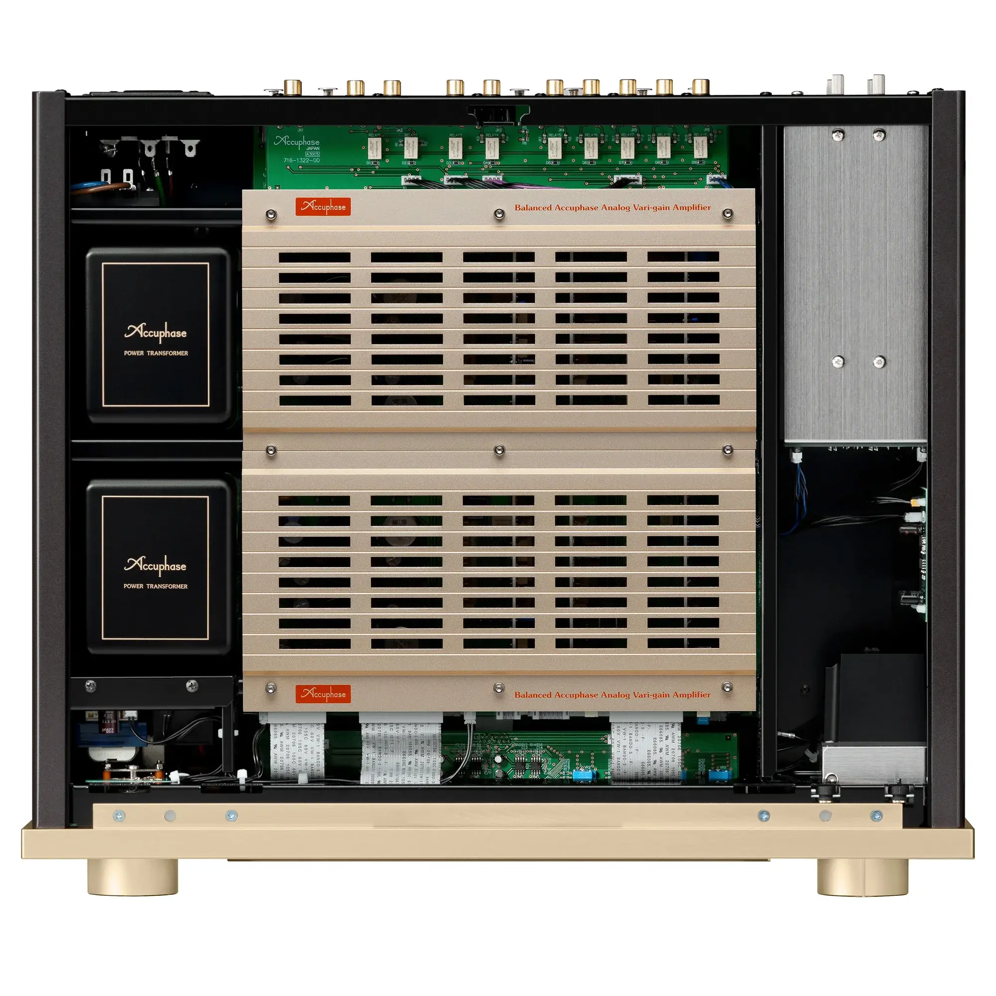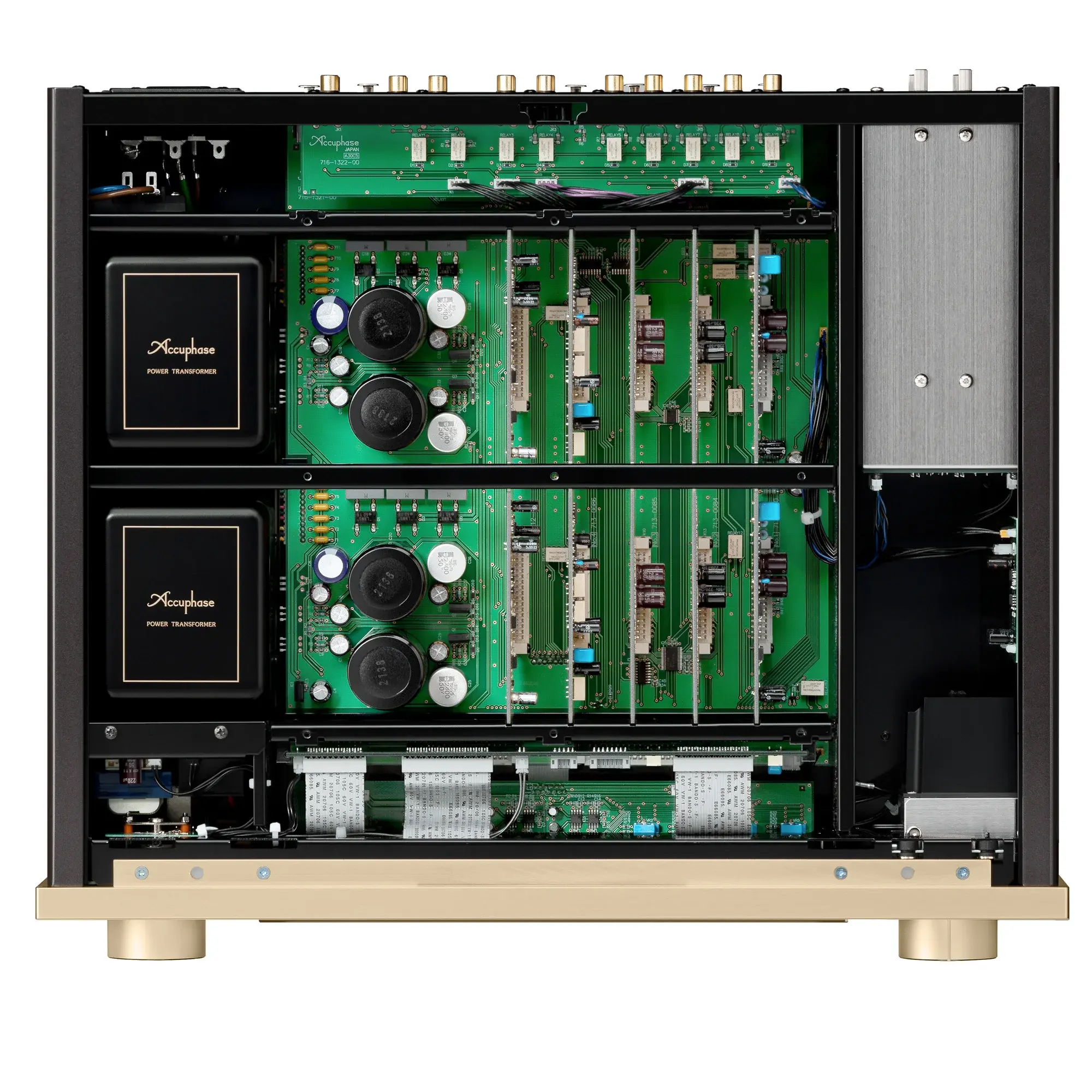 Весь путь аудиосигнала от входа в предварительный усилитель до выхода из усилителя - полностью балансный. В предварительном усилителе Accuphase C-2300 использовано пять блоков усиления сигнала в каждом канале. Печатные платы блоков усиления сделаны из фторуглеродной стеклоткани пропитанной фторуглеродной смолой. Благодаря разделению левого и правого каналов, внимание к деталям в модульных усилителях подавляет электрические помехи и предотвращает любое негативное воздействие на качество звука. Передняя панель сделана из 8 мм высококачественного анодированного алюминия. Конструкция корпуса надёжно защищает схемы от различного рода помех и наводок, а также обладает великолепными антивибрационными качествами.