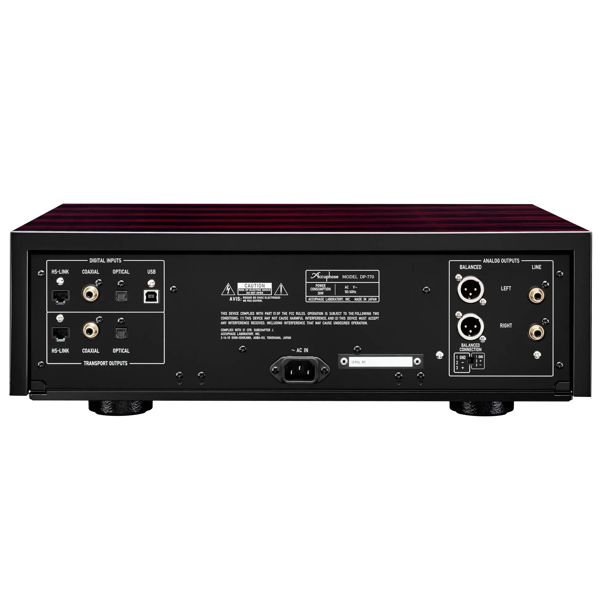 Accuphase DP-770 может похвастаться высокоточным механизмом привода с перемещением с высокой жесткостью. Он оснащенный бесщеточным двигателем постоянного тока с внешним ротором, плавно вращает диски и обеспечивает точное считывание данных. 8 DSD (сигнал DSD) / 8-канальных цифро-аналоговых преобразователей ES9028 PRO (ESS Technologies) типа MDS++ (PCM-сигнал), по 8 параллельным каналам преобразует входные сигналы в высокоточные аналоговые сигналы. DP-770 также включает в себя многочисленные технологии подавления шума, такие как ANCC, для создания непревзойденных музыкальных впечатлений.