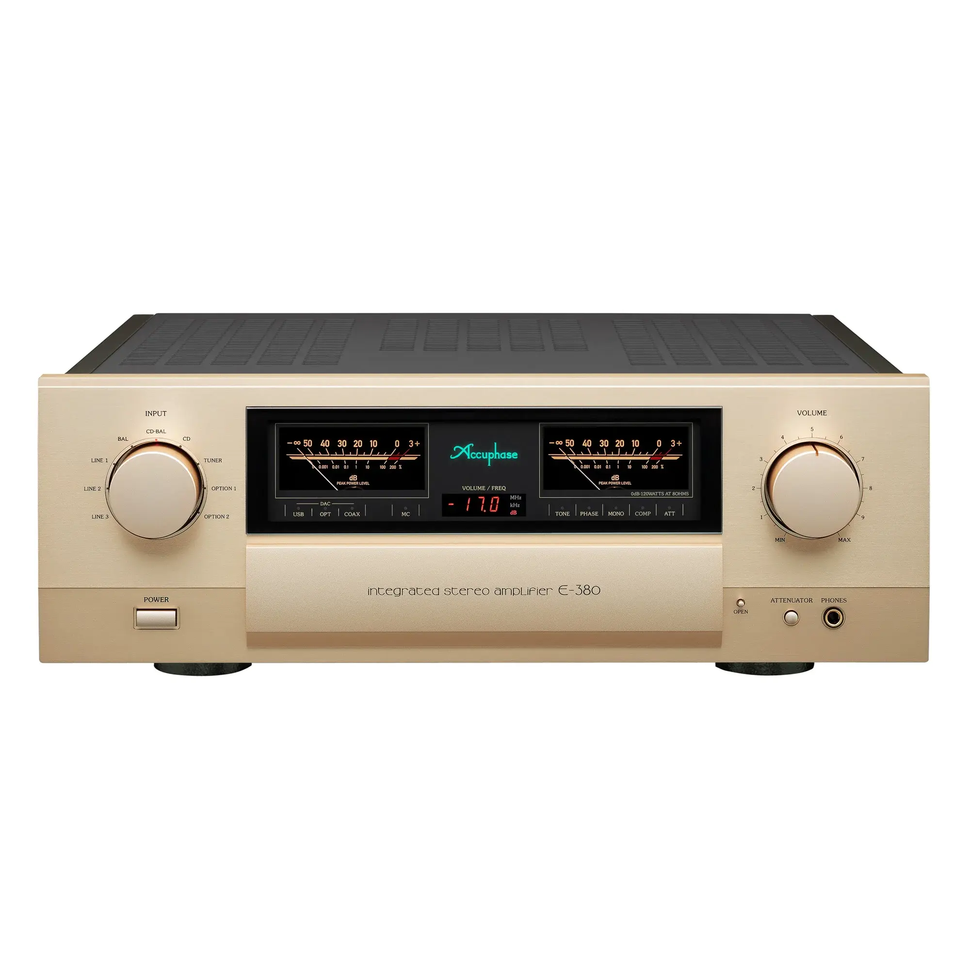 Мощность Accuphase E-380 заявлена на уровне 120 Ватт на канал на 8 Ом, в блоке питания установлен массивный силовой трансформатор, надежно экранированный от слаботочных цепей, и два фильтрующих конденсатора емкостью 33 000 мкф каждый. Выходной каскад построен на парах биполярных транзисторов в параллельной двухтактной конфигурации, которая обеспечивает стабильное питание высокого качества.