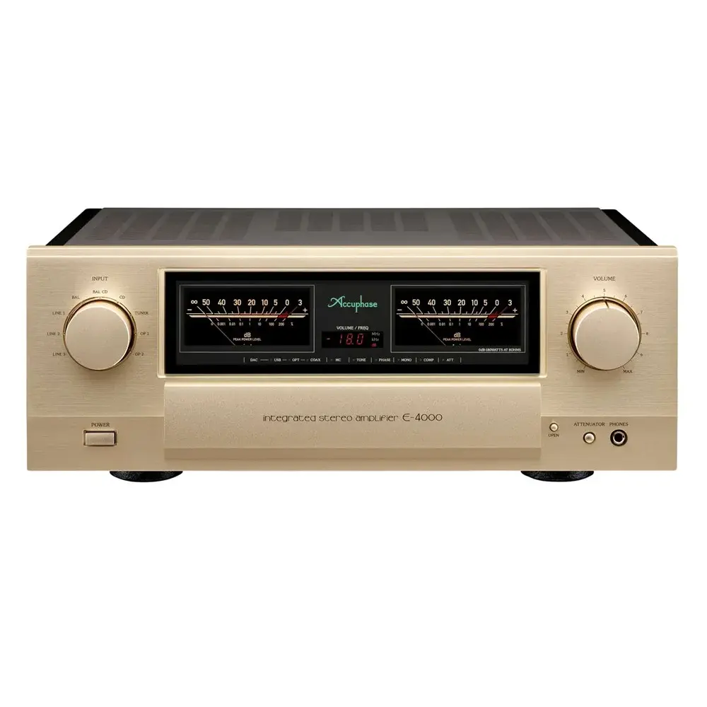 Accuphase E-4000 - интегральный стерео усилитель, который пришел на смену популярной модели E-480. Усовершенствованная система регулировки громкости AAVA позволяет наслаждаться музыкой на любом уровне громкости без малейшего ухудшения качества звука. Секция усиления мощности использует принцип прецизионного усилителя. Конструкция выходной схемы с низким сопротивлением раскрывает весь потенциал каждого динамика. Для расширения возможностей можно добавить две опциональные платы.