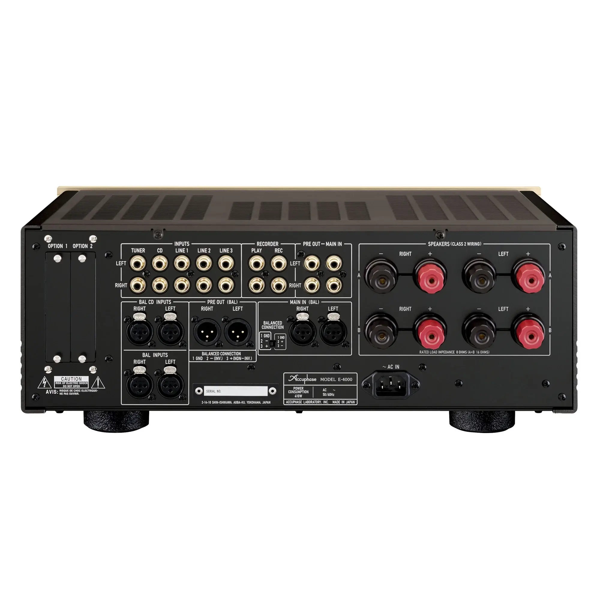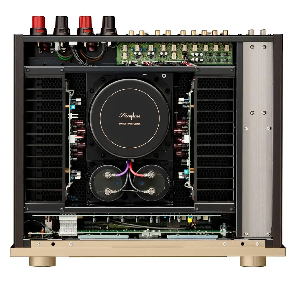 Мощность Accuphase E-4000 заявлена на уровне 180 Ватт на канал на 8 Ом, в блоке питания установлен массивный силовой трансформатор, надежно экранированный от слаботочных цепей, и два фильтрующих конденсатора емкостью 40 000 мкф каждый. Выходной каскад построен на парах биполярных транзисторов в параллельной четырехтактной конфигурации, которая обеспечивает стабильное питание высокого качества.
