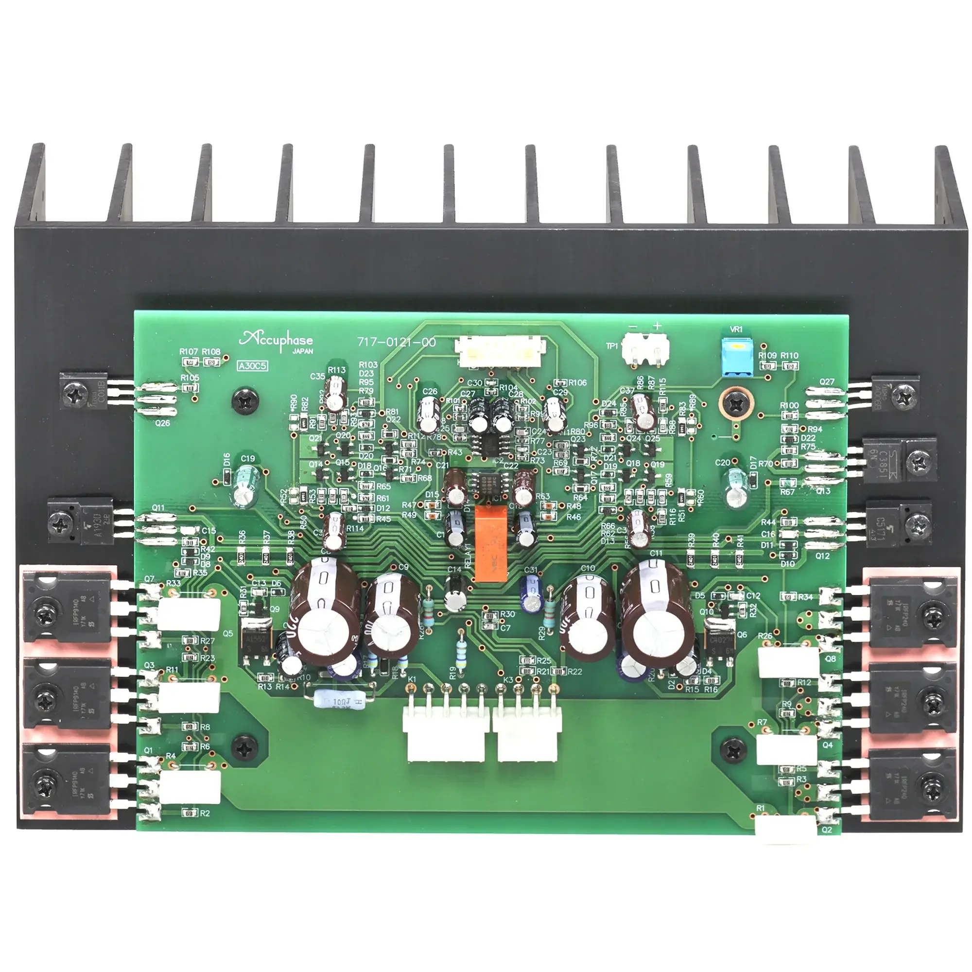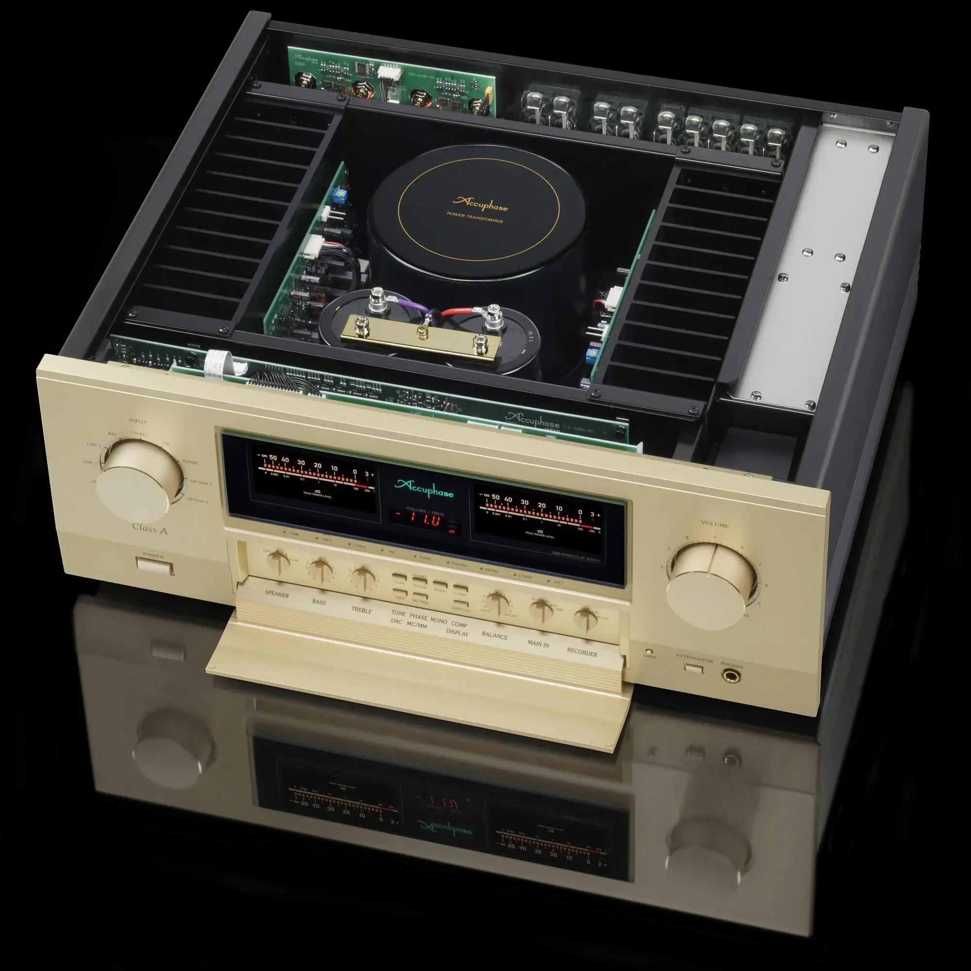 Они работают в чистом классе "А". Выходной каскад поддерживается мощным блоком питания с большим тороидальным силовым трансформатором и фильтрующими конденсаторами емкостью 50 000 мкф каждый. Массивный силовой трансформатор, надежно экранированный от слаботочных цепей, и два фильтрующих конденсатора. Выходной каскад построен на парах биполярных транзисторов в параллельной двухтактной конфигурации, которая обеспечивает стабильное питание высокого качества