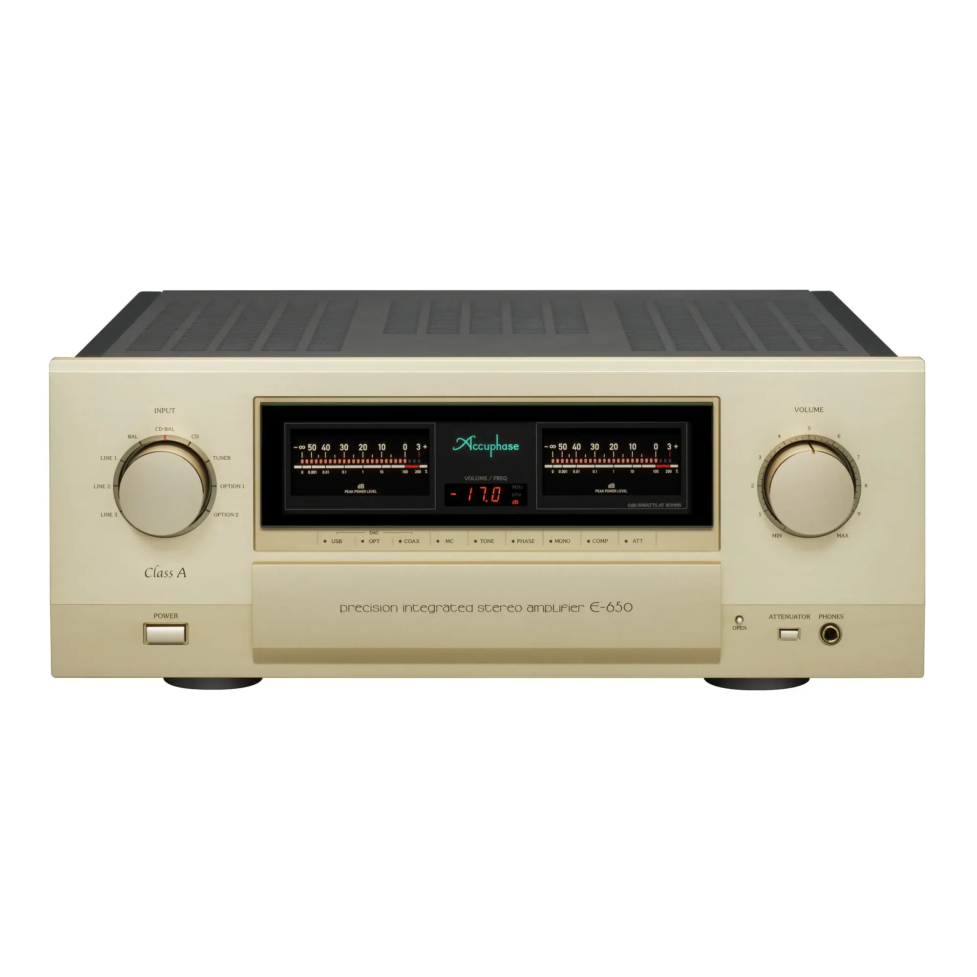 Красивые цифровые жидкокристаллические индикаторы завораживающе двигаются в такт музыке. В позолоченные высококачественные акустические разъёмы вы можете подключать кабели с разъёмами типа "лопатка". Accuphase E-650 это многофункциональный и широко оснащённый аппарат имеющий: регулировку тембра и баланса, отключаемую тонкомпенсацию, включение и переключение двух пар акустики, высококачественный регулируемый выход на наушники, встраиваемый модуль с цифро-аналоговым преобразователем, встраиваемый модуль с ММ/МС фонокорректором, переключатель фазы сигнала на балансном входе (на задней панели усилителя).