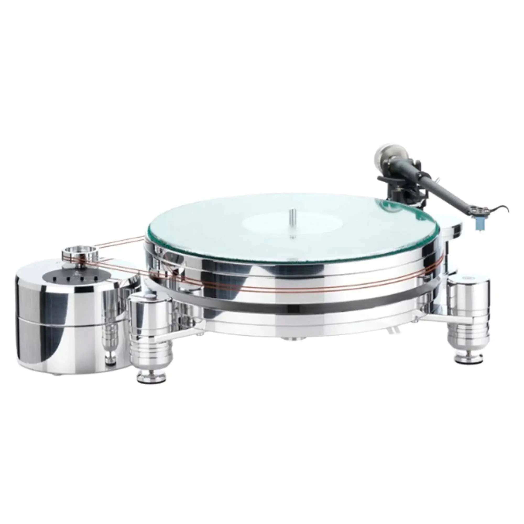 Опорная пластина основания 50 мм, диаметр 180 мм, ножки из цельного алюминия. Виброразвязка с помощью специальных тефлоновых дисков и демпферов из силиконовой смеси. Регулировка высоты с помощью резьбовых шипов, развязанных специальными войлочными ножками. Поворотный диск массой 8 кг и высотой 40 мм выточен из алюминия с прецизионной обработкой на станке с ЧПУ и ручной полировкой. На его поверхности устанавливается изоляционный диск из плексигласа толщиной 4 мм с дополнительной тонкой прокладкой из кожи.