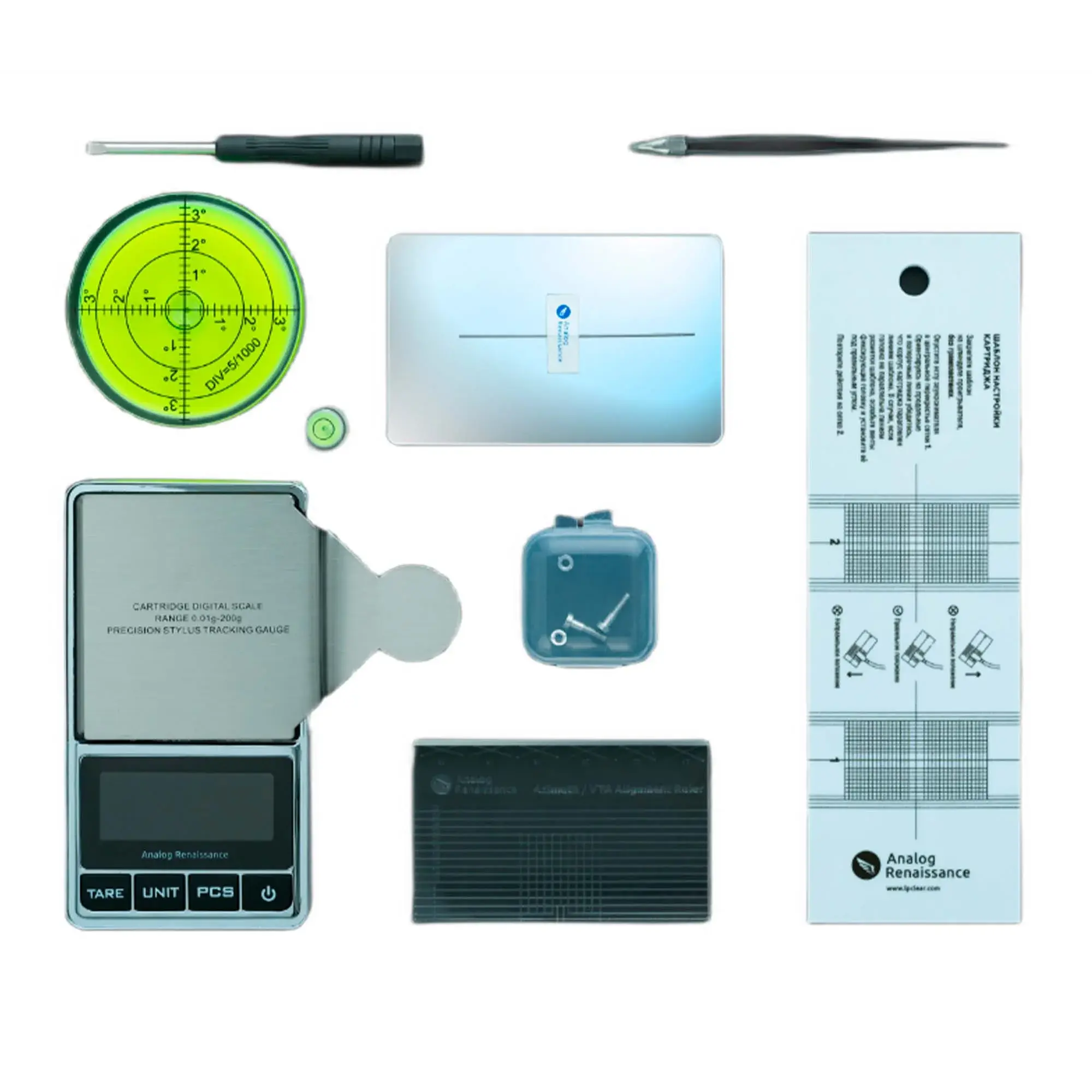 В комплекте есть все необходимое для самостоятельной настройки и апгрейда проигрывателя винила: отвёртка, пинцет, винты и гайки 2,5x11,5 (2шт) используют для монтажа картриджа на шелле тонарма. Малый и большой пузырьковые уровни предназначены для выравнивания основания проигрывателя и шелла. Шаблон для настройки по двум точкам реализован на геометрии Baerwald. Его использую без установки пластинки на опорном диске. Графитовый стержень обеспечит точность выравнивания при использовании шаблона. Акриловый шаблон VTA/Azimuth представляет собой удобный инструмент для настройки комбинации тонарм-картридж-игла. Зеркало - дополнительный инструмент для настройки азимута. Его можно использовать вместе с акриловым шаблоном для максимально точности настройки. Высокоточные электронные весы Stylus Pro-Scale обладают рабочим диапазоном от 0.01 до 200 гр. На весах две площадки для измерений. Stylus Pro-Scale могут определять количество однотипных взвешиваемых элементов.