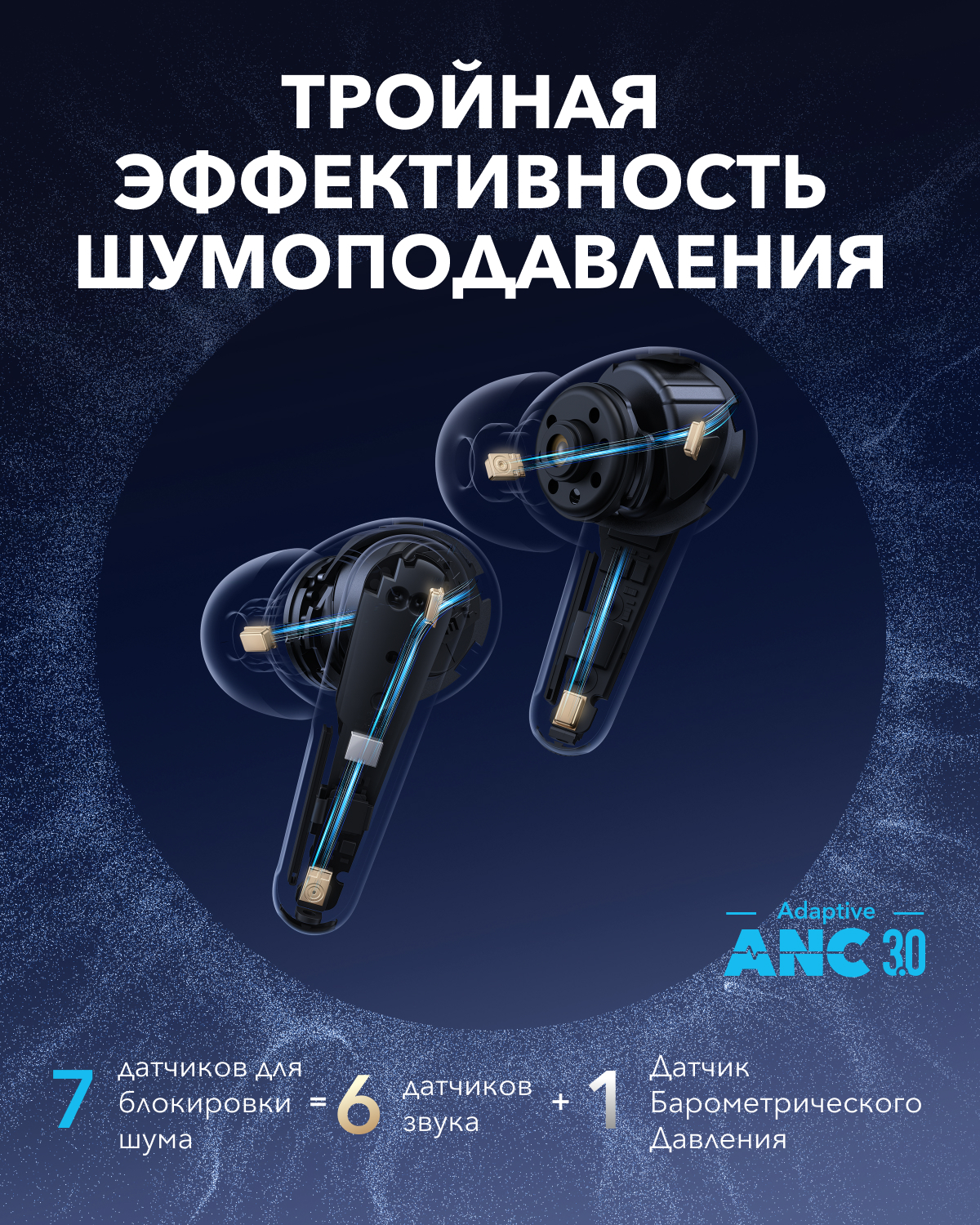 Усовершенствованная технология ANC 3.0 (адаптивного шумоподавления), используемая в наушниках Liberty 4 Pro, каждые 0,3 секунды адаптируется к изменяющимся условиям окружающей среды, обеспечивая бесперебойное шумоподавление. Благодаря специальному датчику атмосферного давления эти наушники даже распознают время полета и соответствующим образом настраивают звук.