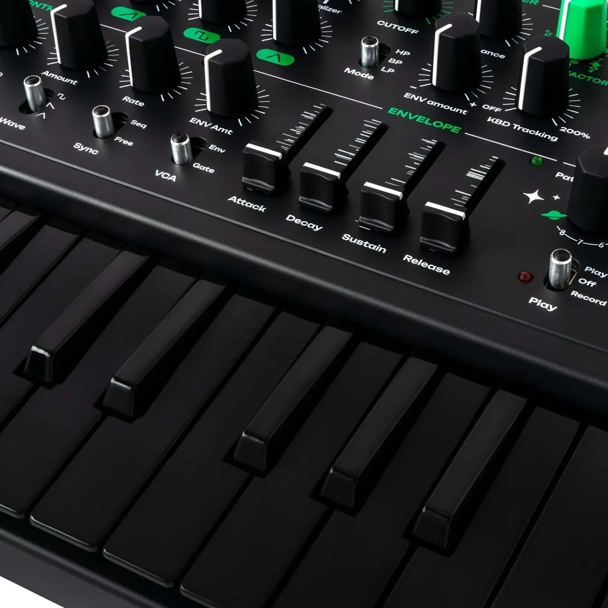 Низкочастотный осциллятор, имеющий синусоидальную, пилообразную и квадратную формы волны, можно синхронизировать с секвенсором. Огибающая ADSR имеет фейдеры для регулировки. Клавиатура имеет 25 мини-клавиш. Предусмотрен аналоговый аудиовход для подключение источников для обработки, вход и выход CV, порт USB для подключения к компьютеру и 5-контактный вход MIDI, а также аудиовыход 1/4 дюйма и джек 1/8 дюйма на наушники.