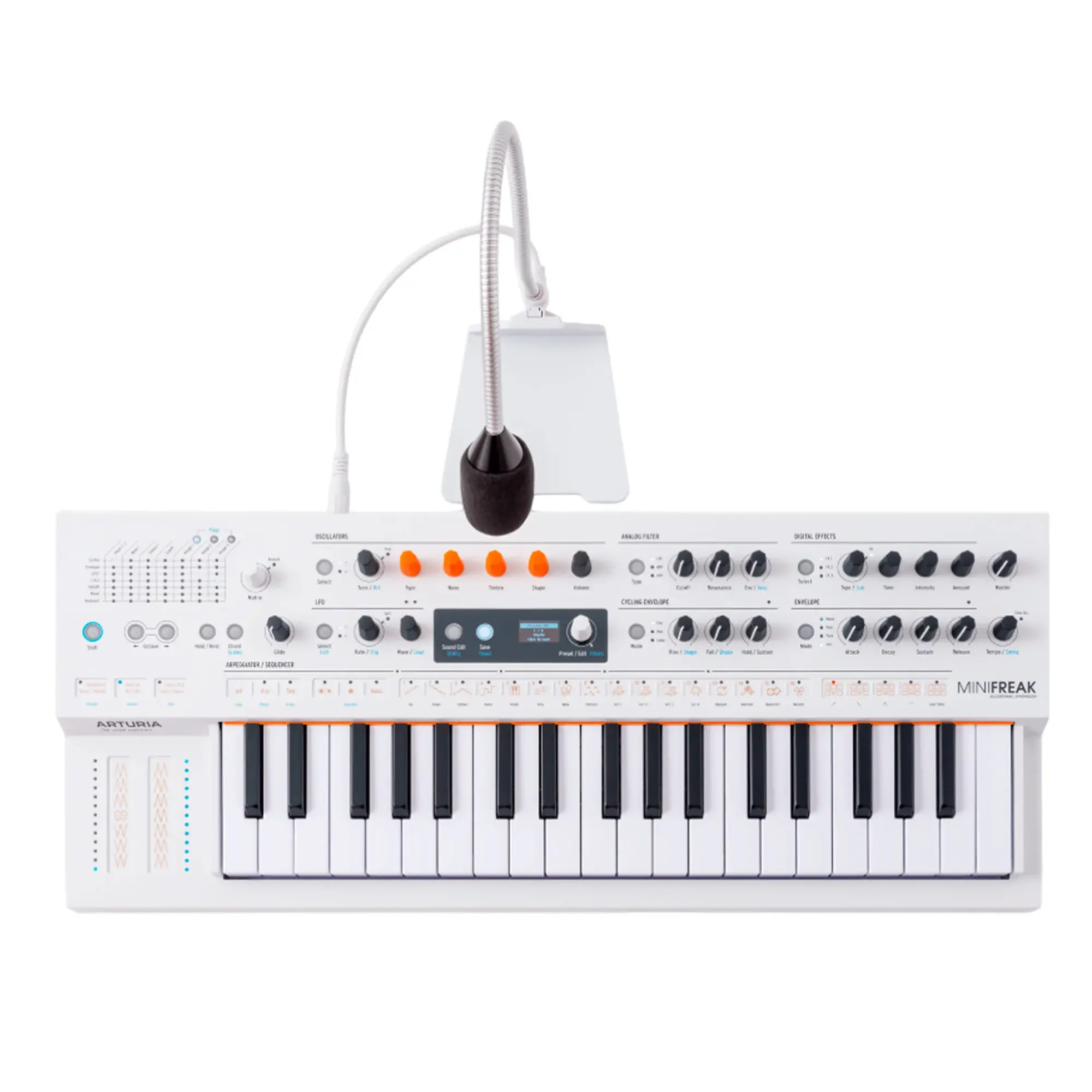 MiniFreak Vocoder — это особая версия полифонического гибридного синтезатора, дополненная вокодером и микрофоном на гусиной шее. Устройство сохраняет все преимущества оригинальной модели, включая 2 цифровых движка, аналоговые фильтры, мощную модуляцию и секвенсор. Теперь пользователи могут экспериментировать со звуком, добавляя вокальные партии или внешний аудиосигнал, трансформируя их в спектральные текстуры или вокодерные эффекты.