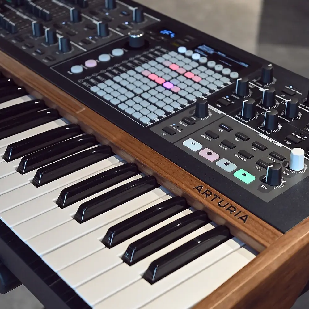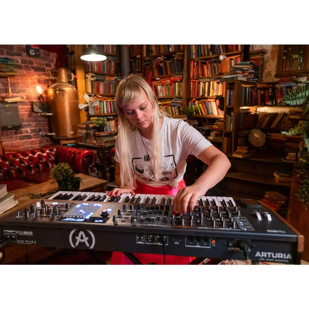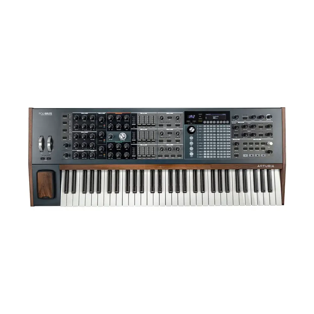 Arturia Polybrute - полифонический аналоговый синтезатор. Синтезатор оснащен 61-клавишной чувствительной к скорости клавиатурой с эффектом послекасания. Модель имеет большое количество элементов управления, включая OLED-дисплей, а также ленточный контроллер и уникальный трехмерный контроллер Morphee XYZ, выполненный из древесины черного ореха. В основе PolyBrute лежит идея морфинга звука.