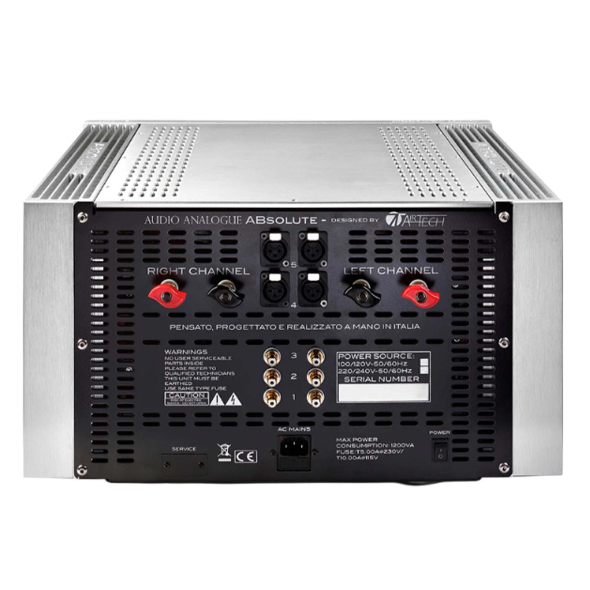 Мощный, универсальный, утонченный, чрезвычайно музыкальный… все это ABsolute, усилитель, который создает новый стандарт в мире High-End & High Fidelity. Схема с нулевой общей обратной связью, разработанная Airtech (конфигурация SeGeSTA — Single Gain Stage Transconductance Amplifier — усилитель с одним каскадом усиления). Все каскады полностью сбалансированы, конфигурация двойного моно и схемы дискретных компонентов. Силовой каскад с 12 биполярными транзисторами на канал, емкость фильтра 81600 мкФ на канал. Увеличенные военные резисторы для минимизации тепловых искажений, аудиофильские компоненты, управление микроконтроллером.