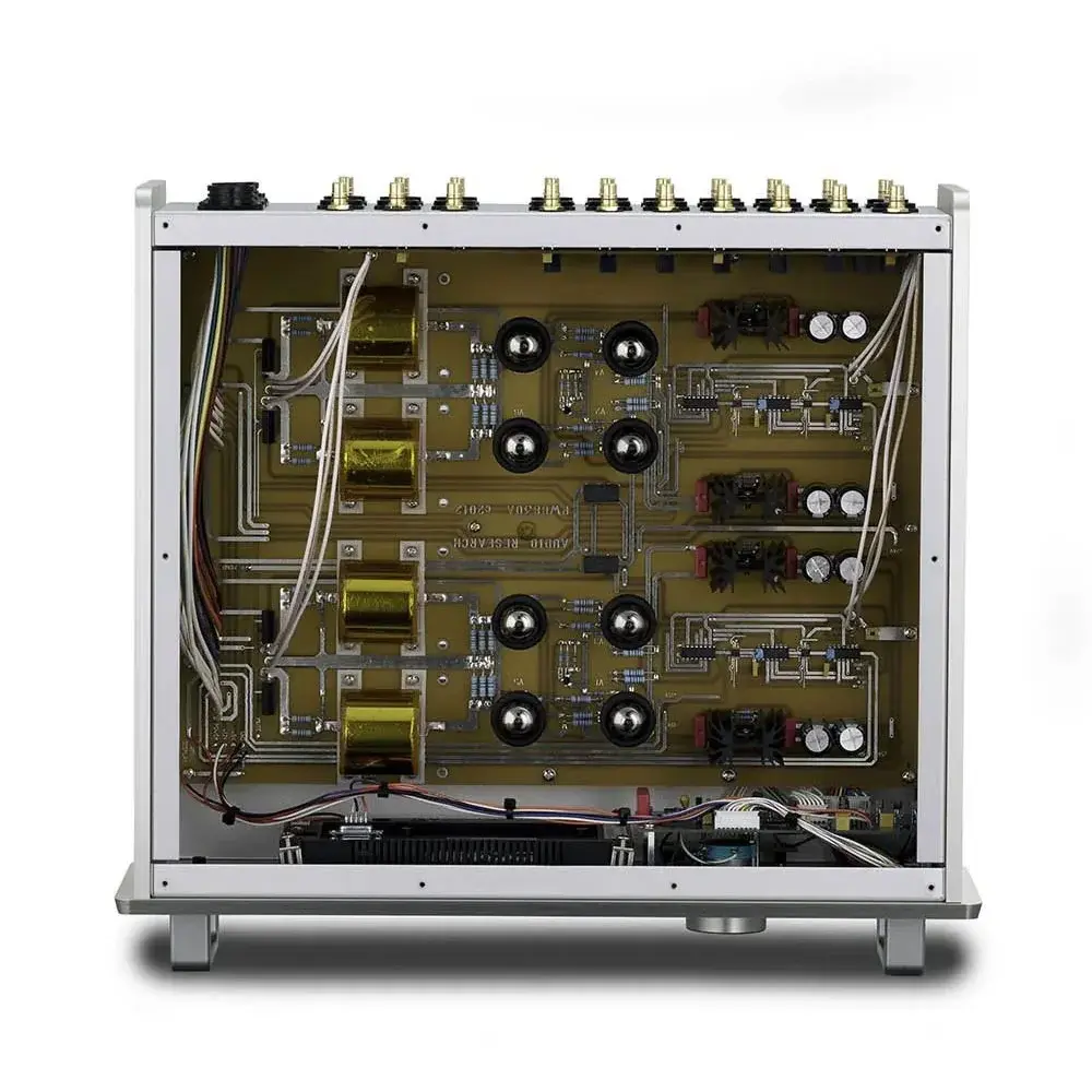Reference 10 это полностью структура Dual Mono от источника питания и через всю аудиосхему. Для каждого канала имеются двойные, отдельные трансформаторы низкого и высокого напряжения; есть двухмодульная регулировка вакуумной лампы (одна 6H30P и одна 6550WE на канал), двухмодовые аудиосхемы (четыре 6H30P на канал) и достаточное количество энергии для серьезного усилителя мощности.