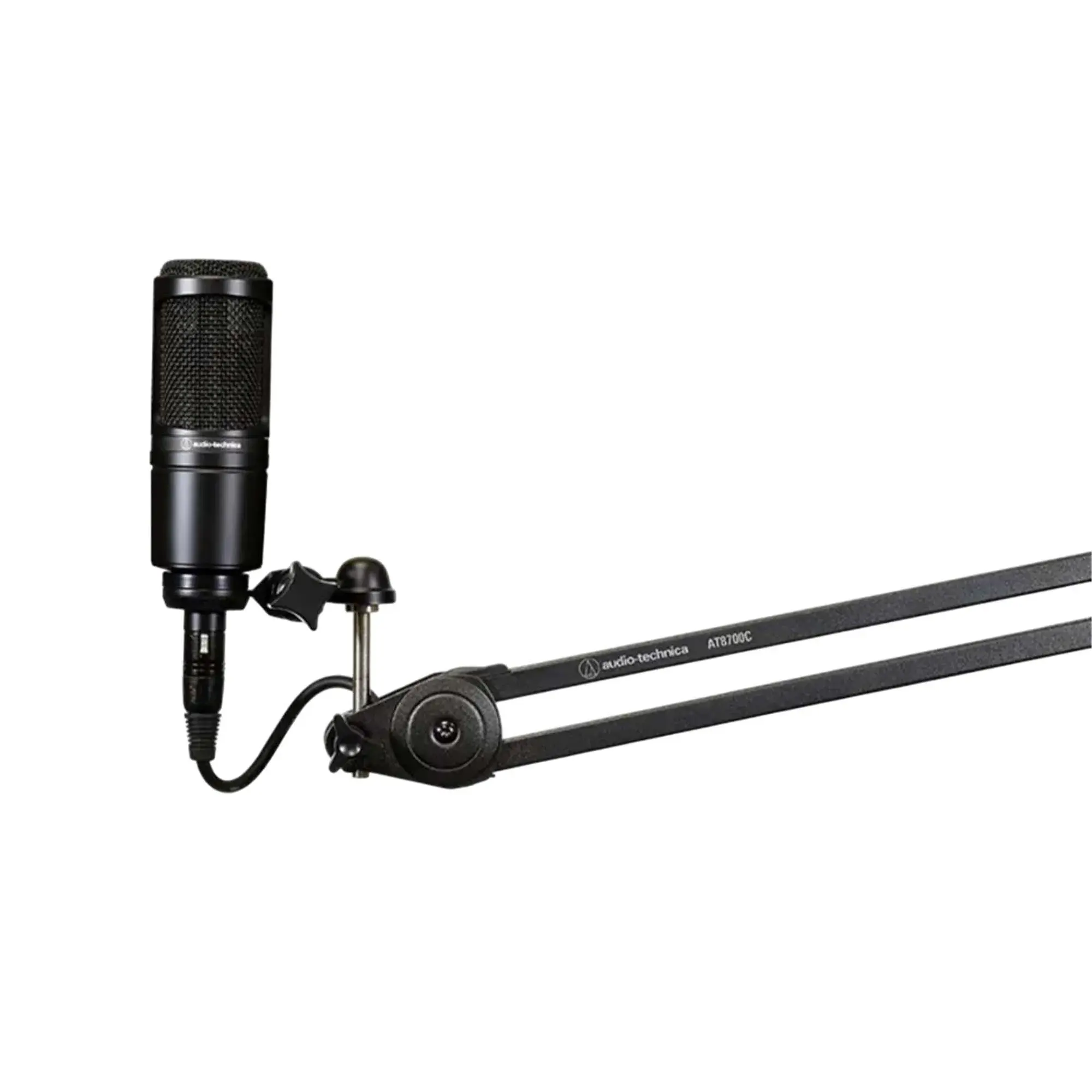 Микрофон комплектуется лёгкой и надёжной стойкой-пантограф AT8700C, которая легко крепится за край стола или полки. Она обеспечивает стабильное позиционирование микрофона, снижая вибрации и упрощая настройку рабочего пространства. Встроенное крепление позволяет быстро зафиксировать микрофон в нужном положении без лишних усилий. Микрофонный кабель XLR-XLR длиной 3 метра также комплектует стойку.