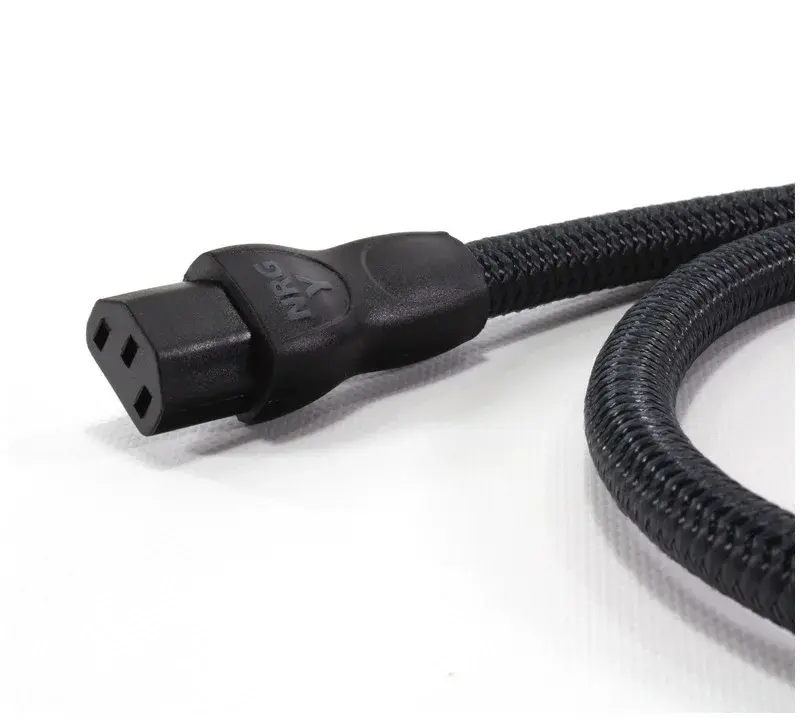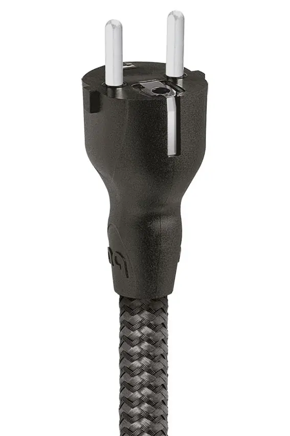 Кабель переменного тока. Проводники из длиннозернистой меди (LGC) в 7-жильном полутвердовом концентрическом устройстве, в котором нити никогда не меняют положение внутри пучка. Плетеный кожух черно-серого цвета.