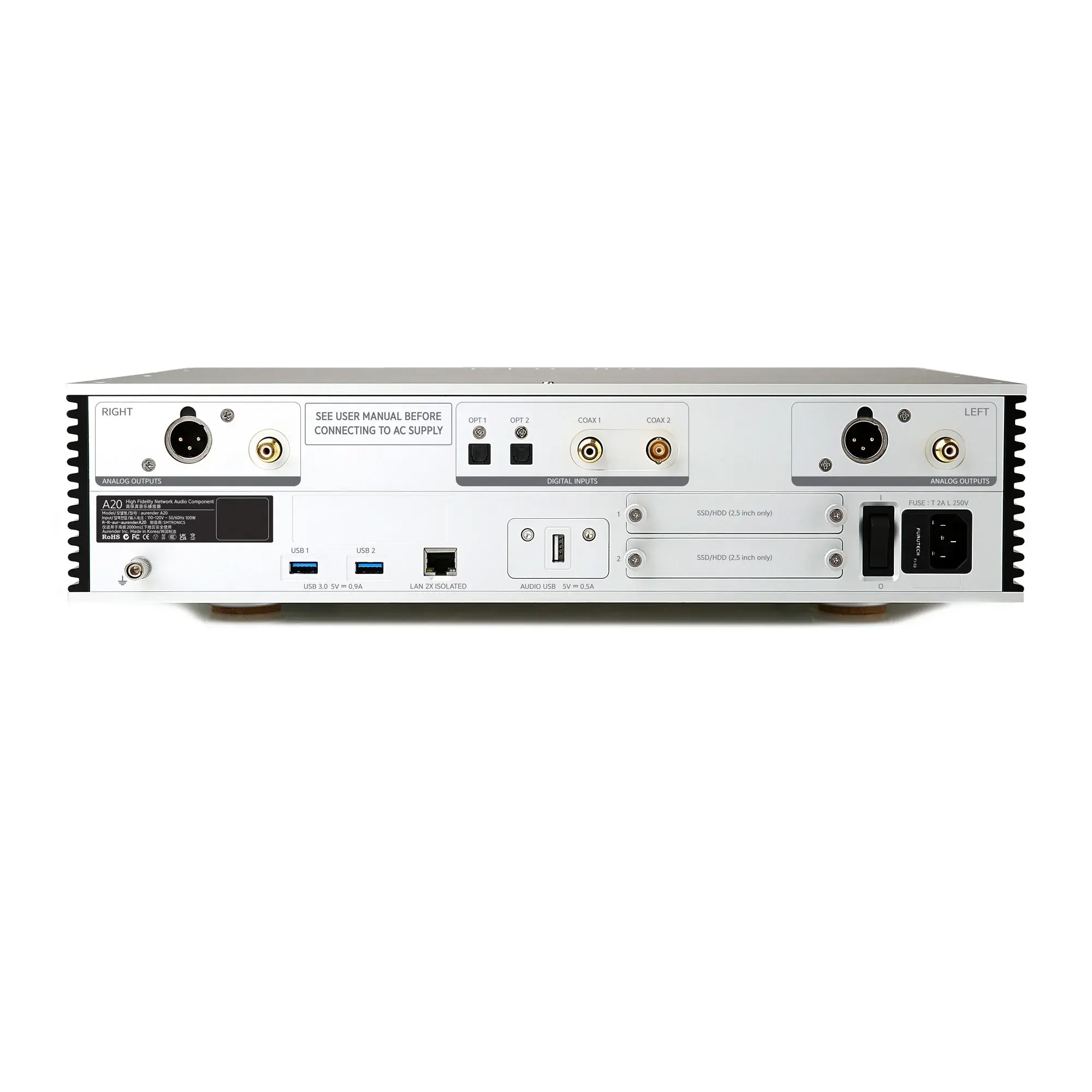Стример Aurender A20 4Tb обладает функциями предусилителя, сервера, внешнего ЦАПа и включает в себя усилитель для наушников с 6.3 мм выходом на фронтальной панели. Проигрыватель имеет почти такую же топологию схем, как у его старшего собрата A30. Присутствуют два слота для 2.5 дюймов HDD- или SSD-хранилищ, а для обладателей больших файловых музыкальных коллекций рекомендуется установить в каждый слот по одному SSD объемом в 8 Тб (16 Тб суммарно). В версии Aurender A20 4Tb задействован HDD объемом в 4 Тб.