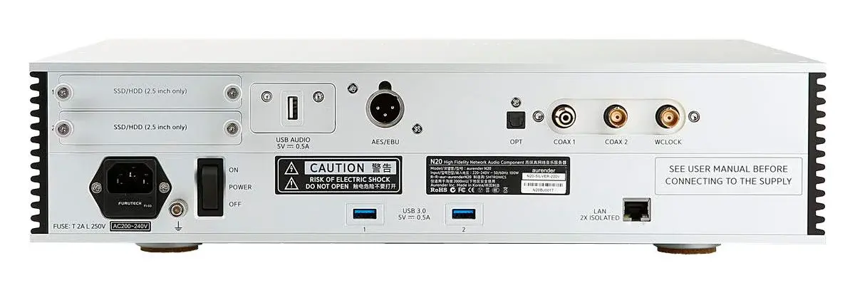 Aurender N20, сочетающий в себе функции аудиофильского стримера и сервера, оборудован двумя слотами для 2,5-дюймовых дисков HDD и SSD. Суммарный объем такого хранилища может достигать 16 ТБ (при установке двух накопителей по 8 ТБ). В данной версии на борту имеется HDD объемом в 8 ТБ. Аппарат оснащается SSD-буфером на 500 ГБ для кэширования аудиофайлов перед воспроизведением, что позволяет увеличить срок службы HDD, уходящего в «спящий» режим сразу после передачи данных в кэш. При этом минимизируются шумы, связанные с работой жесткого диска.