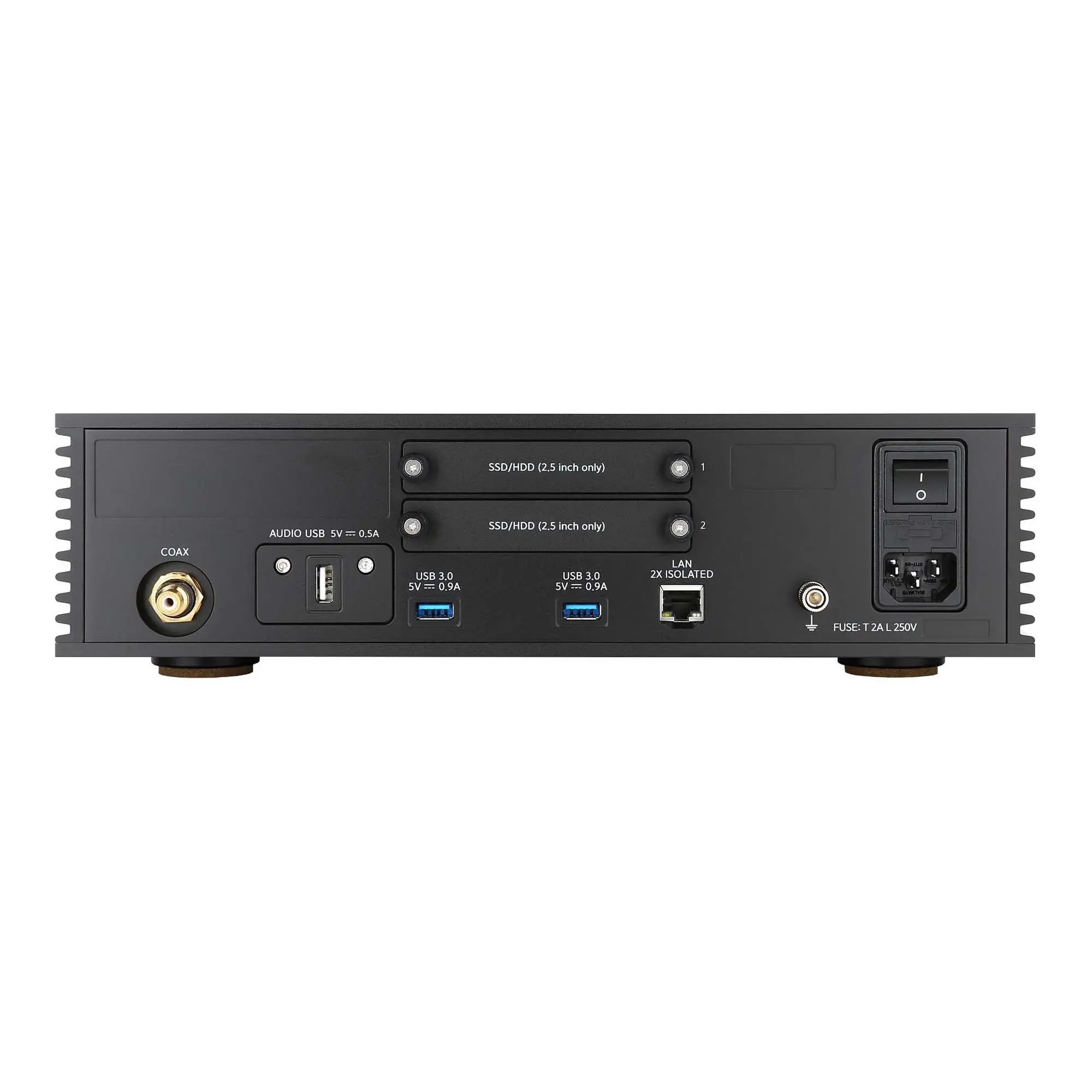 На тыльной панели Aurender N200 помимо слотов для дисковых хранилищ имеется экранированный USB-выход с бесшумной схемой питания, предназначенный для передачи цифрового аудиосигнала на внешний ЦАП. Там же установлен высококачественный коаксиальный выход SPDIF. Также присутствуют два USB-порта для подключения внешних накопителей и гигабитный LAN-порт с двойной гальванической развязкой, предназначенный для получения аудиоконтента, хранящегося на компьютерах и NAS-серверах локальной сети.