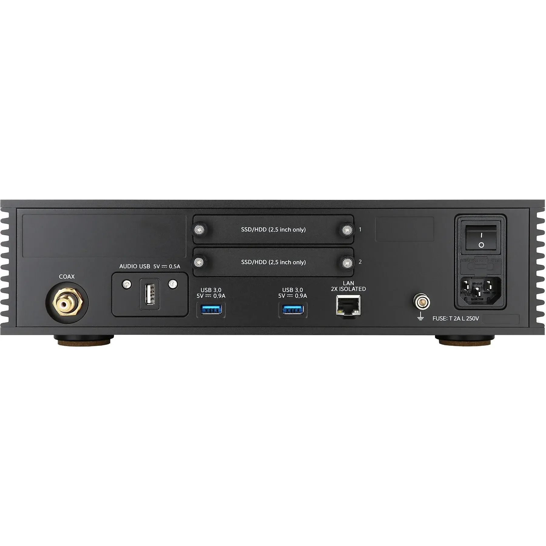 На тыльной панели Aurender N200 помимо слотов для дисковых хранилищ имеется экранированный USB-выход с бесшумной схемой питания, предназначенный для передачи цифрового аудиосигнала на внешний ЦАП. Там же установлен высококачественный коаксиальный выход SPDIF. Также присутствуют два USB-порта для подключения внешних накопителей и гигабитный LAN-порт с двойной гальванической развязкой, предназначенный для получения аудиоконтента, хранящегося на компьютерах и NAS-серверах локальной сети.