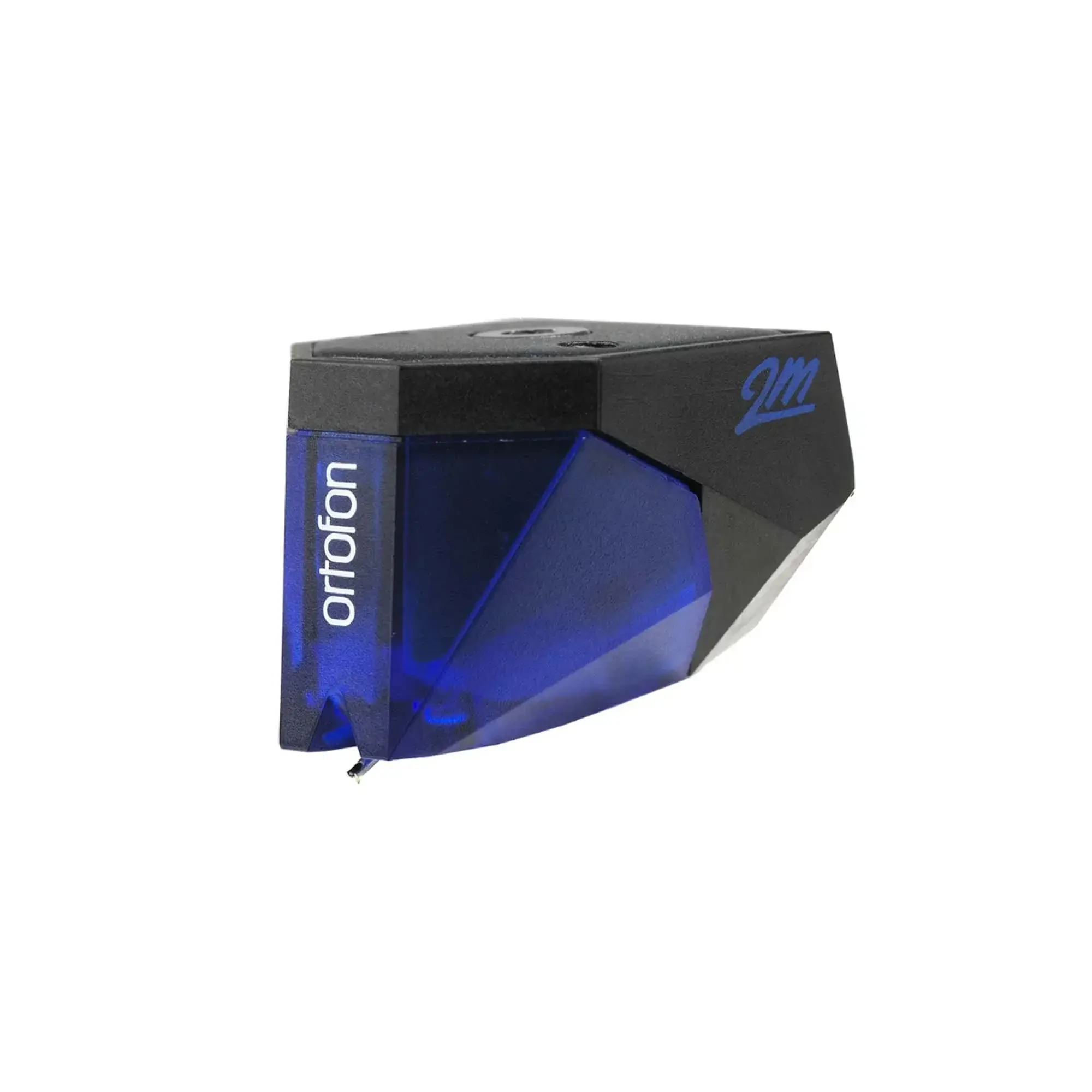 Звукосниматель с подвижным магнитом (ММ-типа) Ortofon 2M-Blue был разработан совместно с датской компанией MollerJensen Design - она также принимала участие в создании топовых MC-головок фирмы Jubilee и Kontrapunkt. Идеей была создание картриджа, своей формой напоминавшей грани бриллианта, отражающегося при движении по канавке пластинки. В названии картриджа обыгрываются две идеи, подчеркнутая связь со современным тенденциями, откуда и появилась цифра 2, а также принадлежность данных картриджей к типу движущихся магнитов (Moving Magnet) MM, т.е двух «М».
