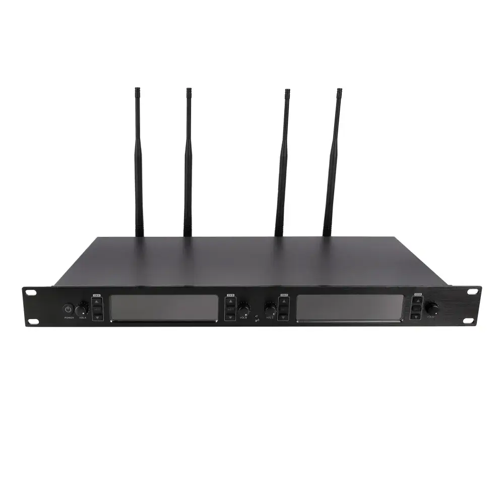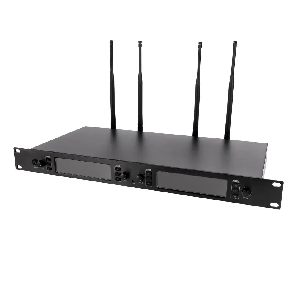 Приемник имеет функцию Quick Scan для выбора лучшего открытого канала частоты, функцию Auto Mute и позволяет отдельно регулировать громкость для каждого канала. Для индикации используются два ЖК-экрана, для программирования – инфракрасные порты. Корпус сделан из стали, сзади расположены разъем Mix на 1/4 дюйма и два XLR-коннектора. Ручные микрофоны оснащены динамическими капсюлями с кардиоидной направленностью. Встроены ЖК-экраны и выключатели.