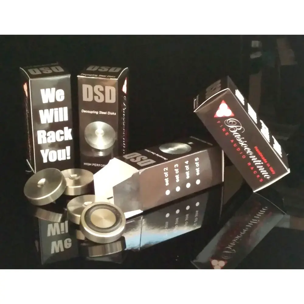DSD (Decoupling Steel Discs) – развязывающие диски, выполненные из нержавеющей стали марки AISI303. В отличие от простых шайб под шипы диски DSD осуществляют функцию полноценной виброразвязки благодаря кольцам из нитриловой резины с высоким демпфинг-фактором. Диски DSD с успехом заменяют обычные шайбы и могут эффективно использоваться с полочными и напольными АС, усилителями, цифровыми и аналоговыми источниками, а также аппаратными стойками. Комплект из 4 дисков.