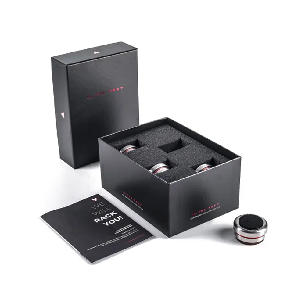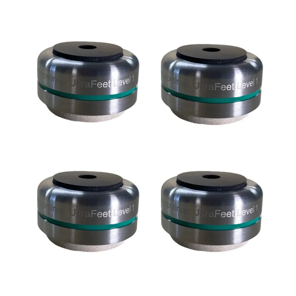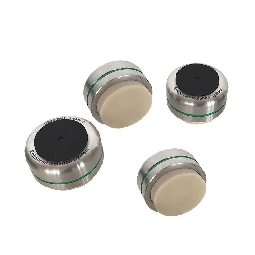 Каждая ножка Ultra Feet получила два виброразвязывающих узла: сверху и снизу. Таким образом, электронный прибор «плавает» на опорах без механического контакта с опорной поверхностью. Вдобавок, каждая опора регулируется по высоте.