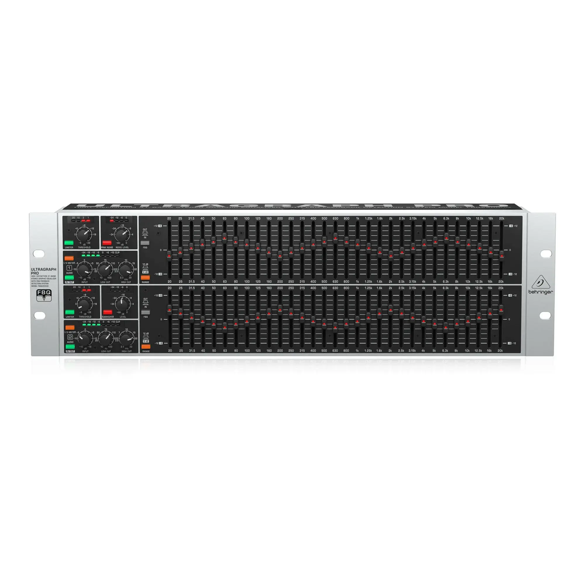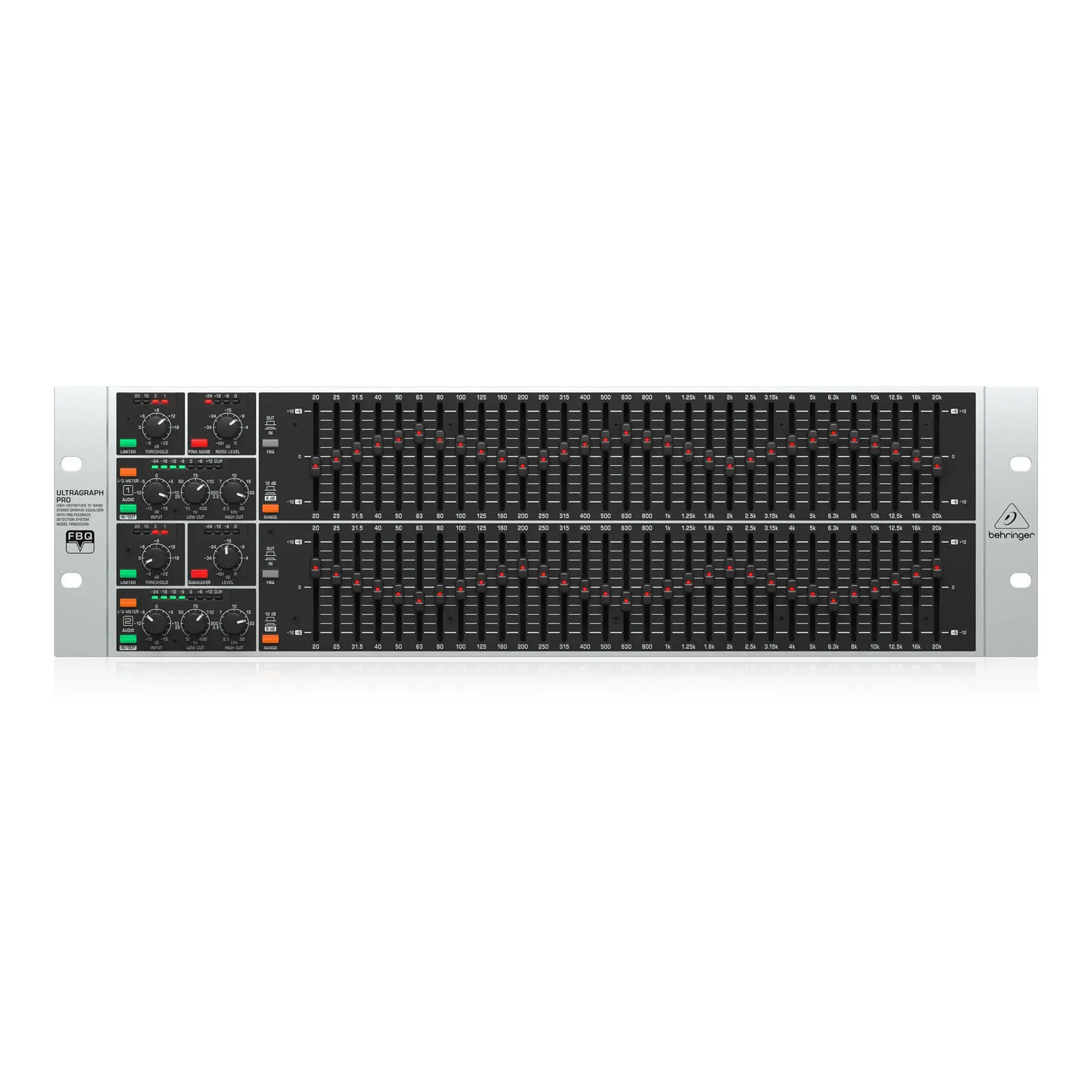 Этот невероятной высокой четкости графический эквалайзер имеет еще больше возможностей, таких например, как переключаемые лимитеры на каждом канале с отдельным индикатором уровня, высококачественные 45-мм фейдеры для повышенной четкости, а также встроенный генератор розового шума (Pink Noise), который позволяет FBQ6200HD функционировать как высоко-точный анализатор аудио спектра.