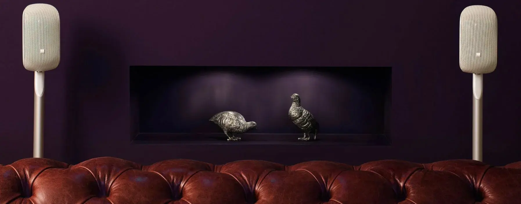 Довольно необычно организована подводка акустического кабеля, которая напоминает крепление шнура питания в настольной лампе. В углублении резиновой накладки подставки спрятан монтажный ключ, с помощью которого ее можно легко отсоединить. В комплект входят кронштейны для настенного крепления. Опционально доступны высокие стойки.