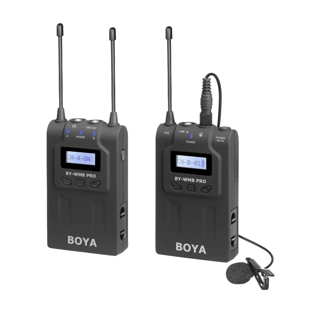 BOYA BY-WM8 Pro — это усовершенствованная двухканальная УКВ беспроводная микрофонная система для записи двух источников звука, имеет удобный в прочтении ЖК-дисплей, обеспечивает широкополосную передачу данных в радиодиапазоне, имеет систему ФАПЧ и цифровую электросхему. Система имеет широкий спектр применения: проведение интервью, электронный сбор новостей (ENG), внестудийное видеопроизводство (EFP), кинопроизводство, применение в бизнес и образовательных проектах и многое другое. Особенности: двухканальный беспроводной приемник; 48 каналов УКВ; возможность выбора стерео/моно режима; микрофон и линейный вход; функция отключения звука; удобный в прочтении ЖК-дисплей; функция автоматической блокировки ЖК-дисплея; мониторинг звука через выход для наушников (приемник); более 6 часов непрерывной работы; дальность действия может достигать 100 м (без препятствий); две батарейки типа АА в передатчике и приёмнике; Характеристики системы: тип осциллятора: PLL синтезированный генератор; диапазон передачи: 576,4 МГц-599,9 МГц (передатчик: A), 568,6 МГц-592,1 МГц (передатчик: B); каналы: 48; частотная характеристика: от 40 Гц до 18 кГц (+/- 3дБ); дальность действия: 100 м (300 футов) (без препятствий); рабочая Температура: от 14 ° F до 122 ° F (от -10 ℃ до +50 ℃); температура хранения: от 14 ° F до 131 ° F (от -10 ℃ до + 55 ℃); Характеристики передатчика: выходная мощность: ≤10 мВт; антенна: проводная антенна 1 / 4λ; побочное излучение: 250 нВт или менее; аудиовход: 3,5-мм мини-джэк; уровень входного аудиосигнала: -60 дБВ (вход MIC, ослабление 0 дБ); отклонение: ± 5 кГц (-60 дБВ, вход 1 кГц); диапазон частот на входе: 20 Гц-20 кГц; искажение: 0,5% или менее; источник питания: две батареи размера AA; время работы: около 6 часов; размеры: 208 × 67 × 29 мм; вес: 80 г без батарей; Характеристики приёмника: антенна: проволочная антенна 1 / 4λ; аудиовход: 3,5-мм; соотношение сигнал-шум: 70 дБ или более; искажение: 0,5% или менее; уровень выходного сигнала наушников: 30 мВт (16 Ом); уровень выходного аудиосигнала: -60 дБВ; источник питания: две батареи размера AA; время работы: около 4 часов; размеры: 208 × 67 × 29 мм; вес: 90 г без батарей; Характеристики микрофона: тип микрофона: электретный конденсаторный; диаграмма направленности: всенаправленный; диапазон частот: 35 Гц ~ 18 кГц; соотношение сигнал / шум: 74 дБ SPL; чувствительность: -30 дБ +/- 3 дБ / 0 дБ = 1 В / Па, 1 кГц; разъем: 3,5 мм; длина: 1,2 м (4″); Комплектация: приемник; передатчик; всенаправленный петличный микрофон; кабель c разъёмами стерео mini-Jack-BMP; кабель с разъёмами XLR-m - BMP; зажим для микрофона; ветрозащита; зажим для ремня; адаптер на "башмак"; документация.