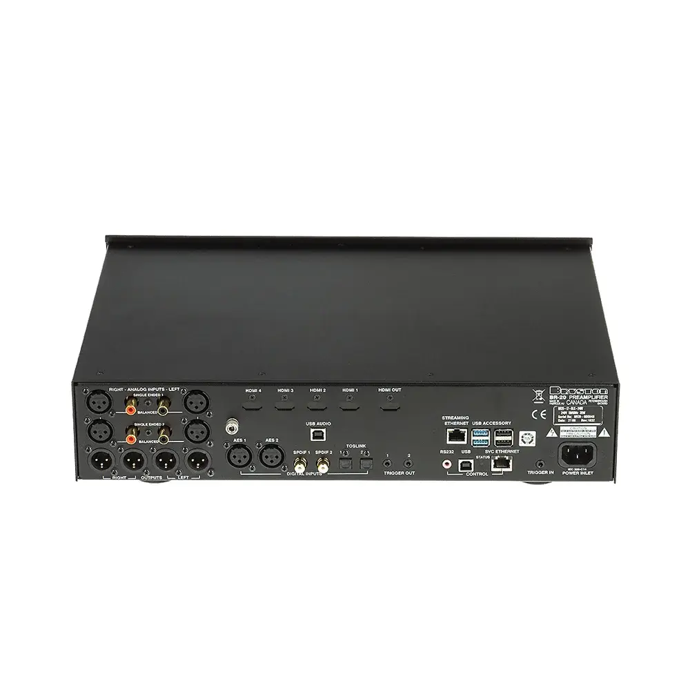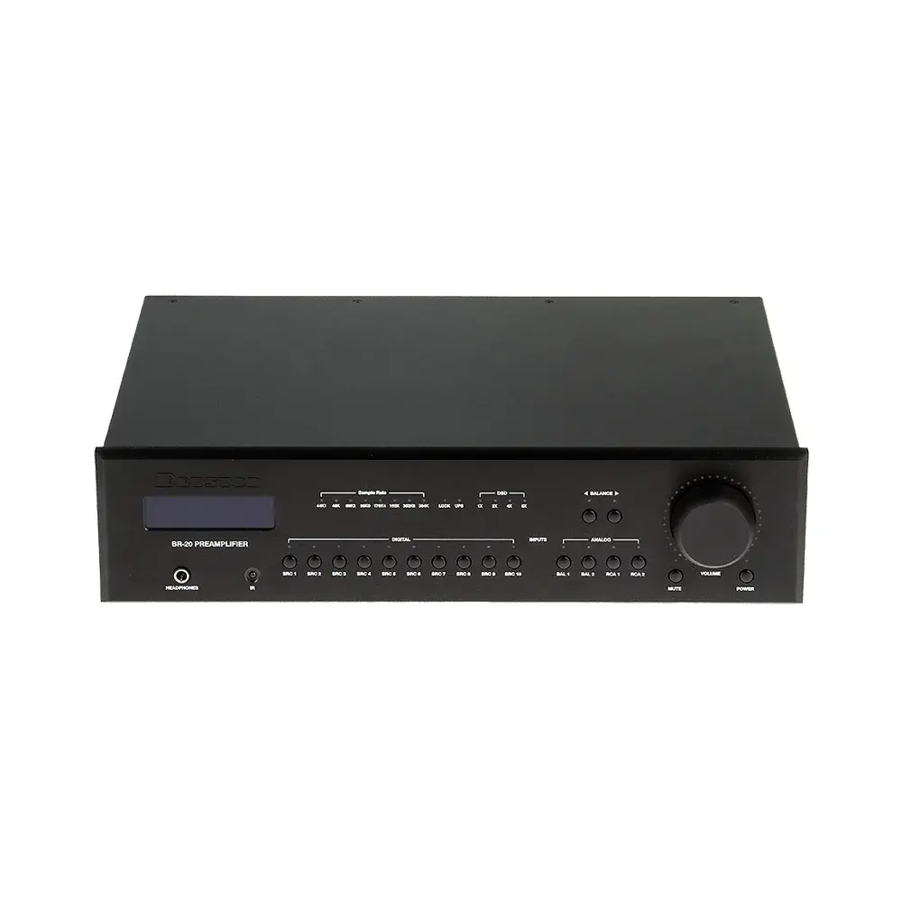 Предварительный усилитель Bryston BR-20 спроектирован в полностью балансной концепции. Здесь реализовано независимое питание аналоговой и цифровой части. Цифровая подсистема включает сетевой стример и ЦАП, причем, модель готова работать как с сетевыми хранилищами в домашней сети, так и с популярными стриминговыми lossless сервисами типа Tidal и Qobuz. Блок ЦАП может обрабатывать потоки PCM с параметрами вплоть до 24 бит / 384 кГц, а также DSD до DSD256. Кроме того, Bryston BR-20 умеет получать контент DSD через HDMI, для чего необходимо будет приобрести опциональную плату с четырьмя портами HDMI.