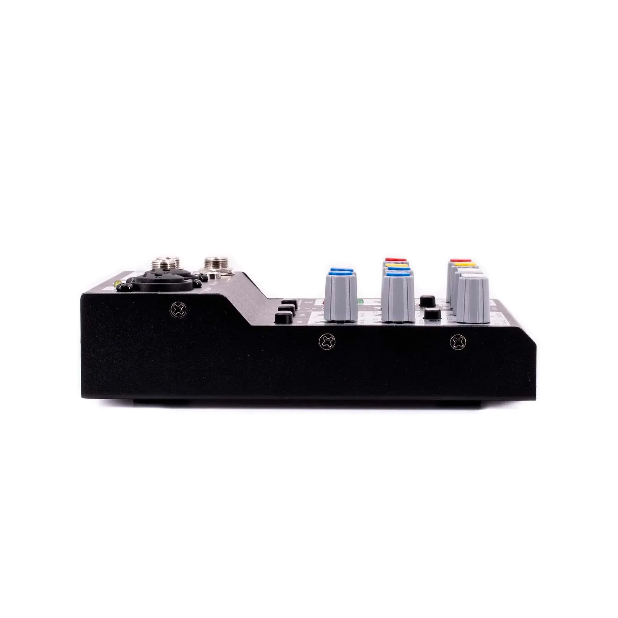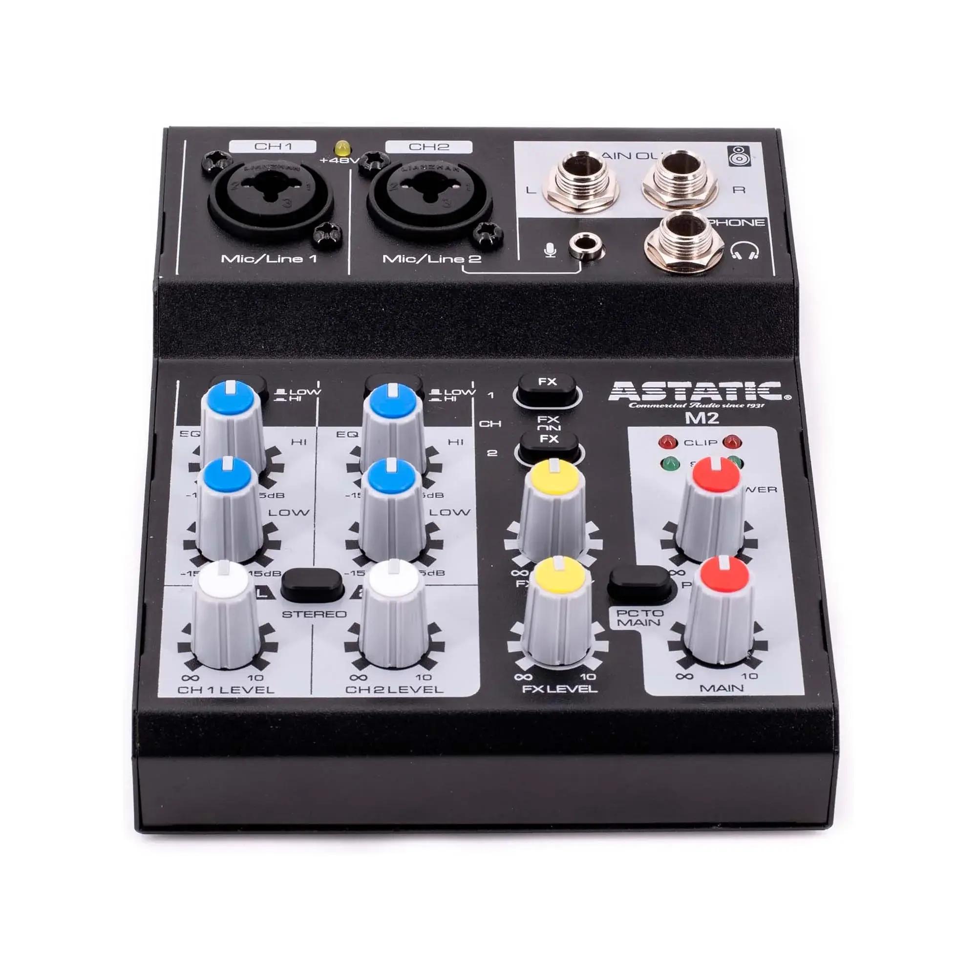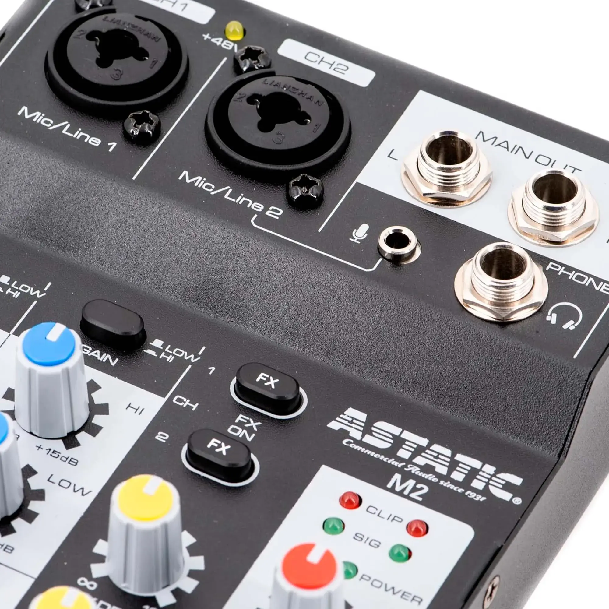 M2 имеет два комбинированных XLR/1/4" входа, два балансных 1/4" TRS основных выхода, один 1/4" выход для наушников и 3,5-мм микрофонный вход для гарнитуры, который направляется на второй канал для микширования. Выбираемое фантомное питание +48 В позволяет использовать любой конденсаторный микрофон или питать микшерную лампу. Каждый канал имеет выбираемые вставки реверберации FX с выделенными регуляторами уровня и глубины, регуляторами громкости и 2-полосным полочным эквалайзером для быстрого создания идеального микса.