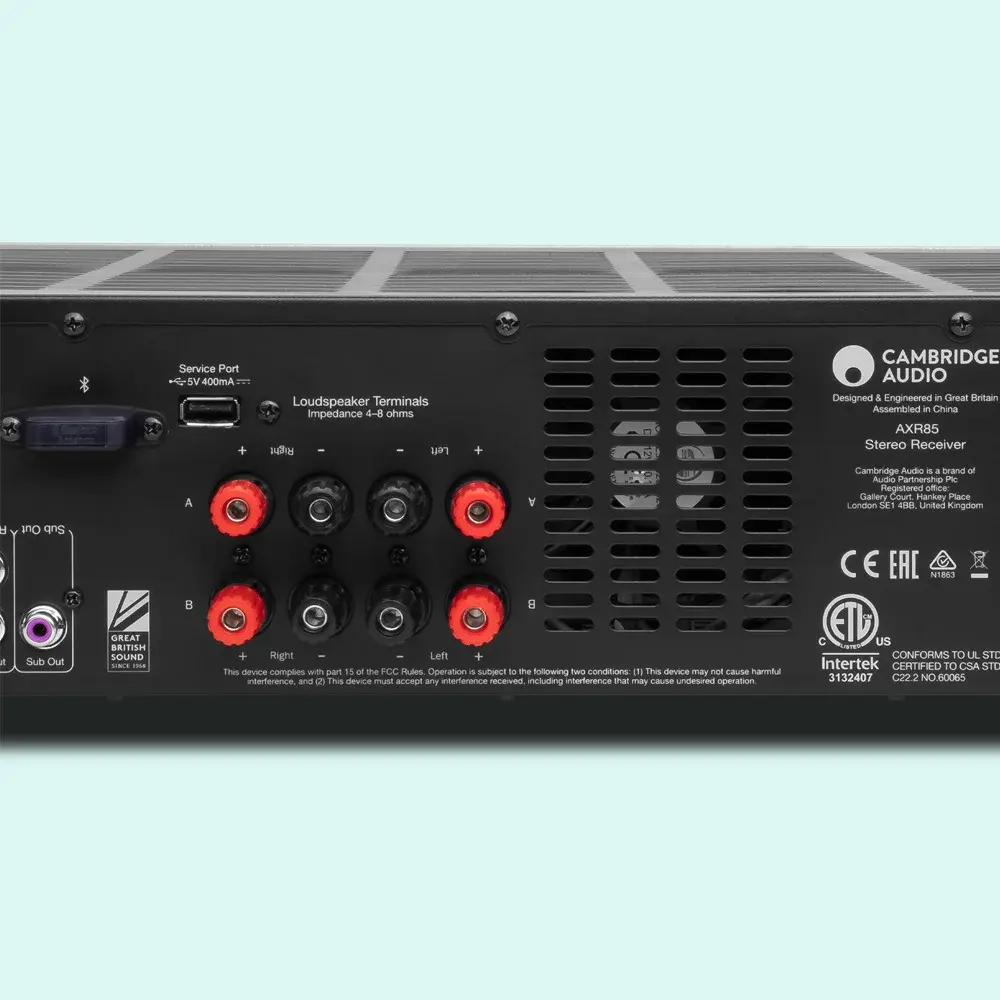 На тыльной стороне корпуса помимо разъемов фонокорректора имеется набор линейных входов RCA, а также фиксированный линейный выход для записи (RCA) и разъем для подключения активного сабвуфера, с помощью которого можно акцентировать басовую составляющую аудиосистемы. Четыре пары винтовых клемм позволяют легко организовать бивайринг или подключить две пары 8-омных акустических систем и расположить их в разных комнатах. При этом Cambridge Audio AXR85 может работать даже с 4-омными спикерами, однако производитель не рекомендует использовать одновременно две пары колонок с импедансом в 4 Ом. Модель комплектуется универсальным пультом ДУ, позволяющим управлять не только ресивером, но и CD-проигрывателями Cambridge Audio из линейки AX.