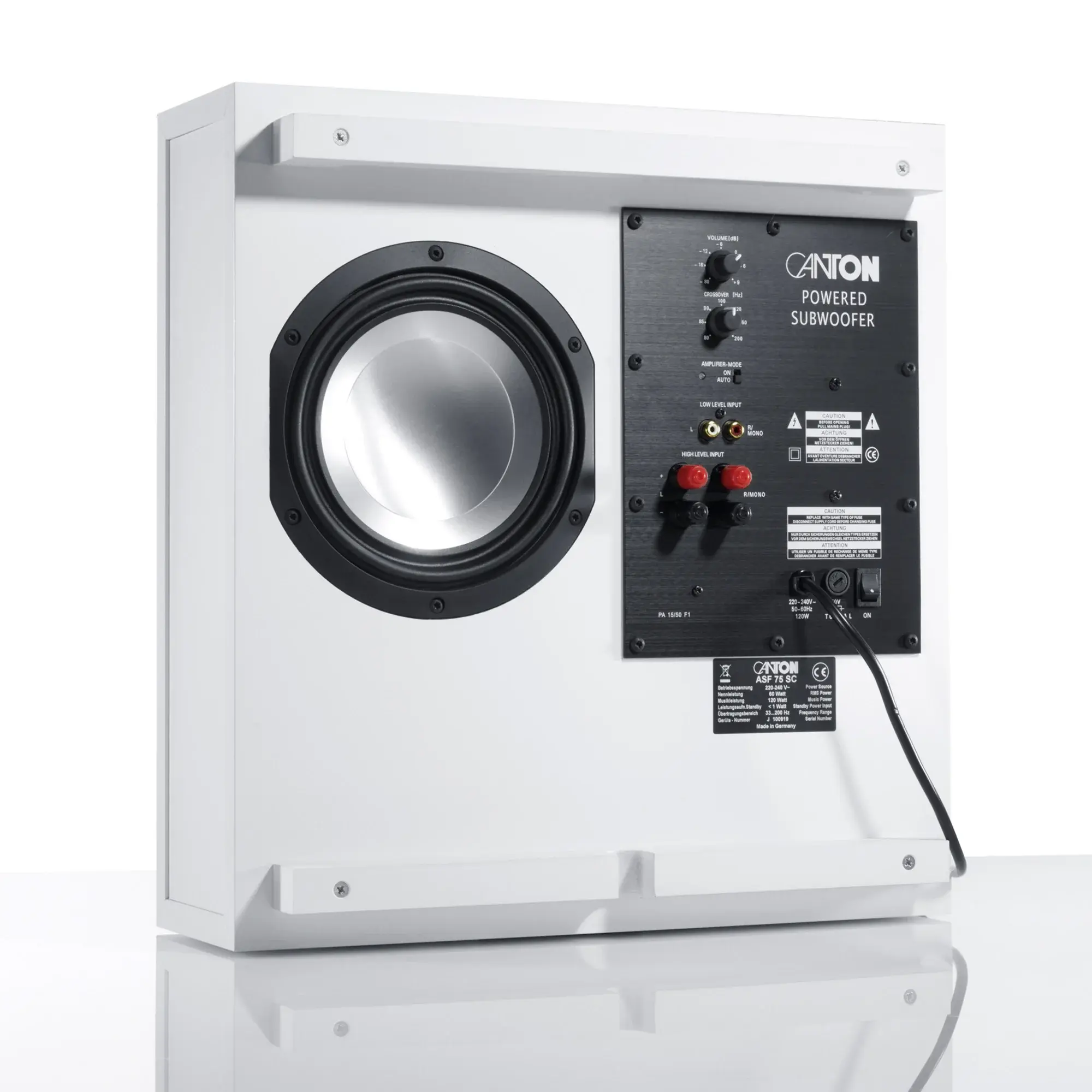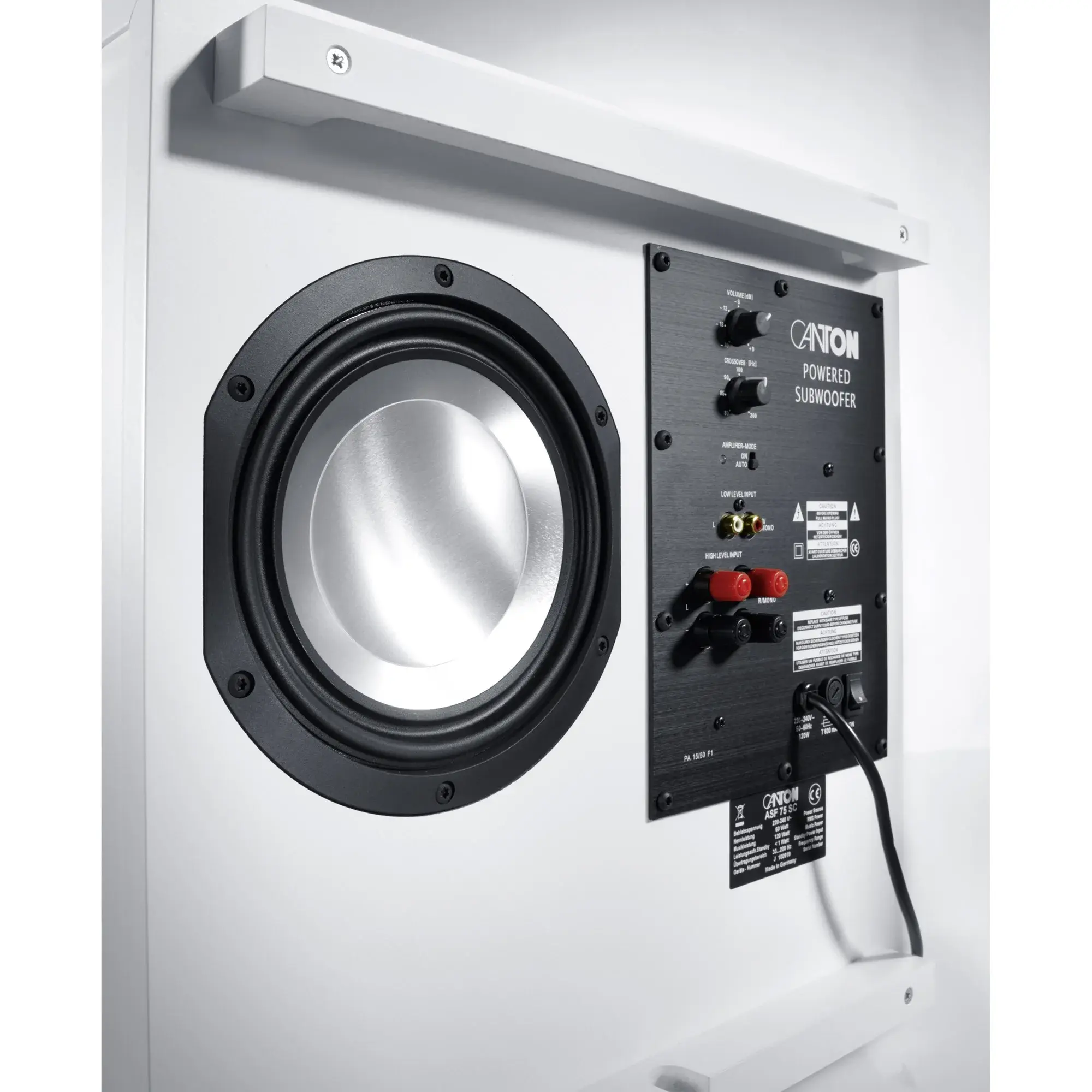 Компактный сабвуфер для настенного крепления c возможностью установки в стойку, за/под мебель. Активный сабвуфер Canton ASF 75 SC выполнен в плоском корпусе фазоинверторного типа с нижним расположением динамика.