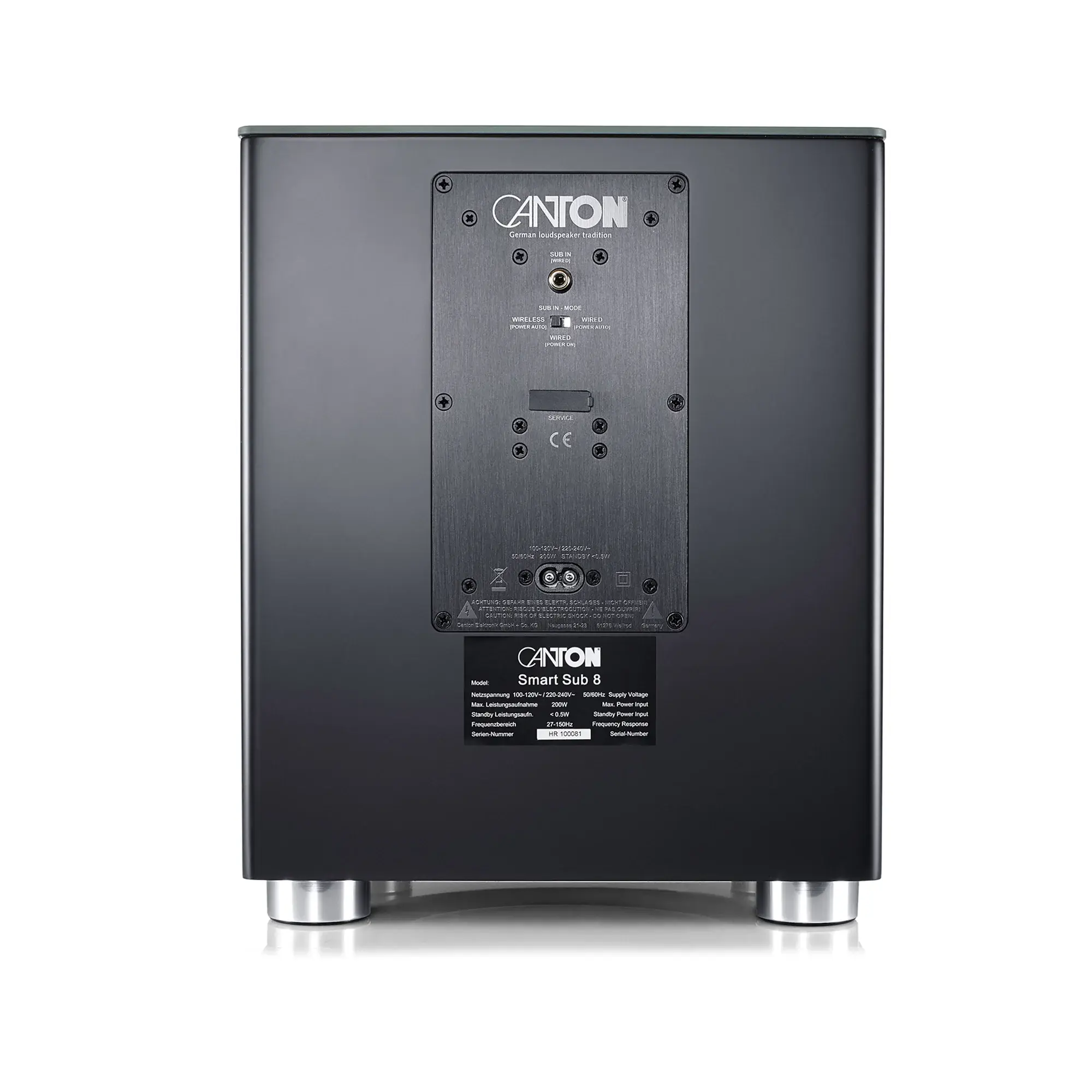 Беспроводной сабвуфер Canton Smart SUB 8 и порадует всех тех любителей кино и музыки, которые просто хотят нажать на газ при просмотре фильмов и прослушивании музыки, чем это было возможно раньше. SUB 8 предлагает невероятно глубокие басы с безудержной динамикой. Интеллектуальный беспроводной активный сабвуфер находится в своей стихии всего от 27 Гц.