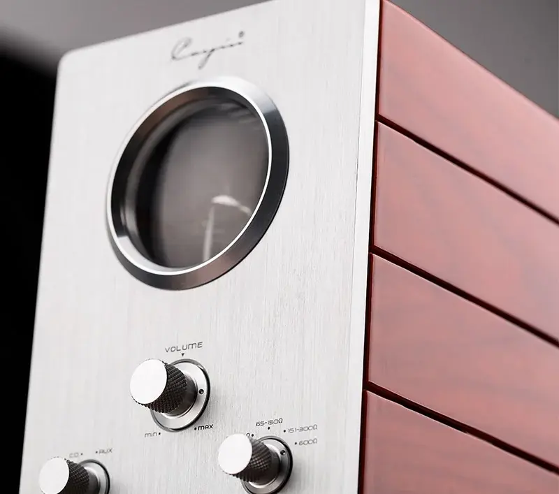 Также на передней панели появились два дополнительных регулятора. Один отвечает за выбор входа, второй - за выбор сопротивления подключаемых наушников.