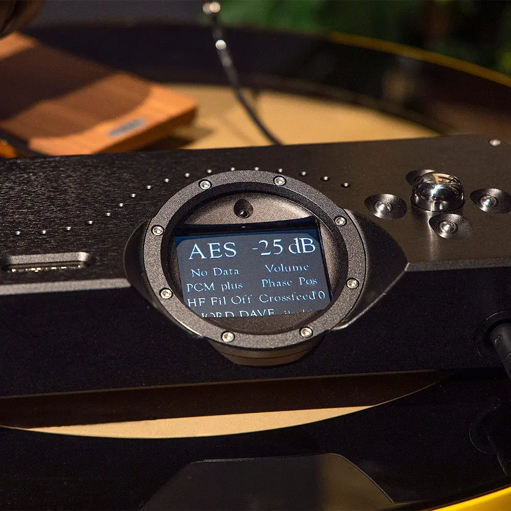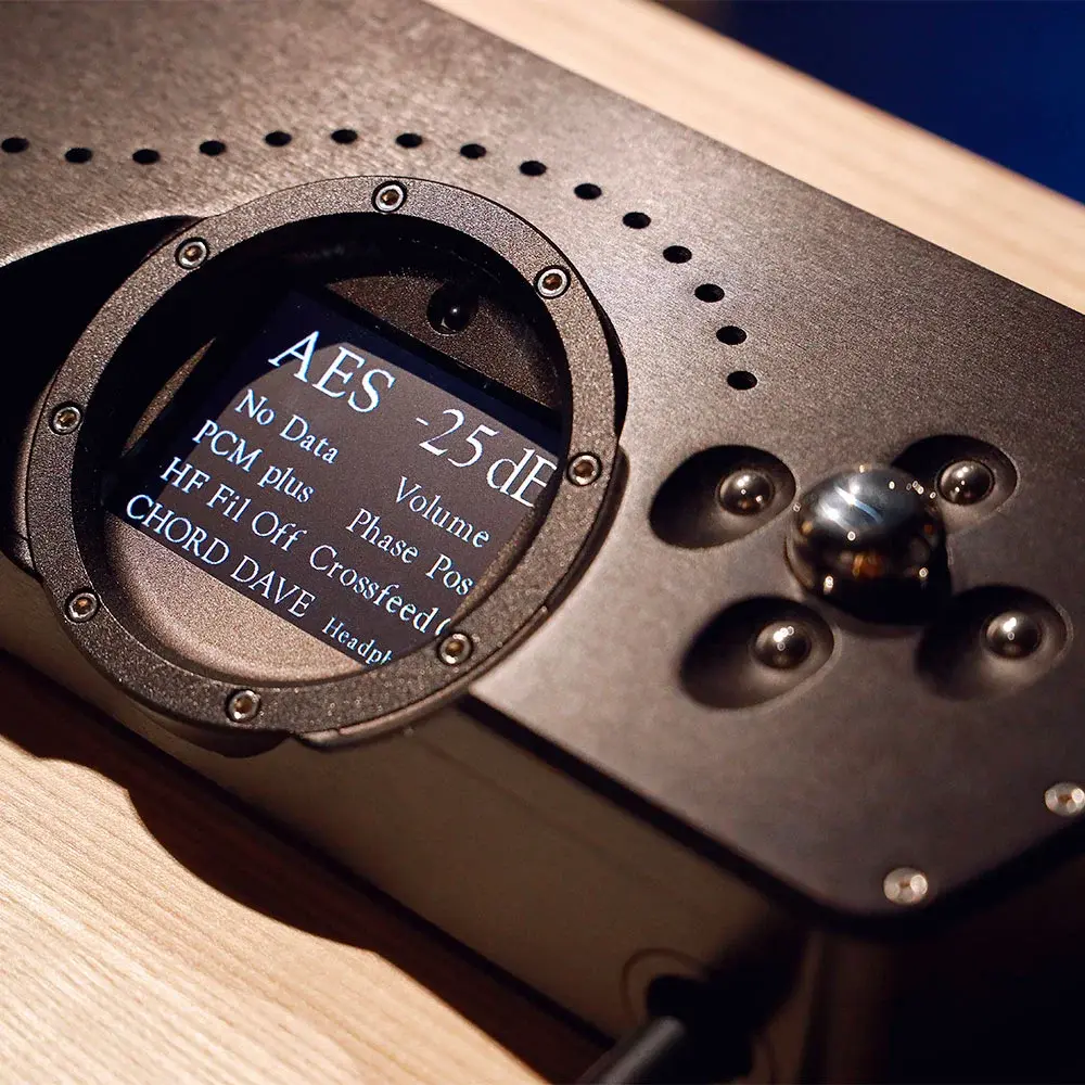 Еще одно преимущество DAVE перед его предшественниками – полноразмерный ЖК-дисплей, отображающий выбранный пользователем вход, частоту дискретизации, уровень громкости + остальные настройки и параметры. Расположенный за мгновенно узнаваемым «иллюминатором», дисплей отлично читается под любым углом и меняет цвет в зависимости от уровня громкости или частоты дискретизации (привет от Chord Hugo!). На передней панели DAVE расположился энкодер с крупными кнопками из нержавеющей стали и шарообразным тумблером; также к аппарату прилагается пульт ДУ.