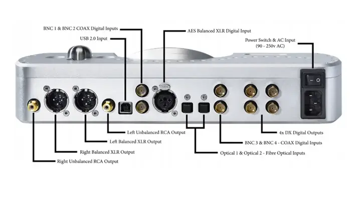 Входы: USB типа B, DXD и Quad DSD, 2x оптических 44кГц, 1x AES 44 кГц, 4x коаксиальных