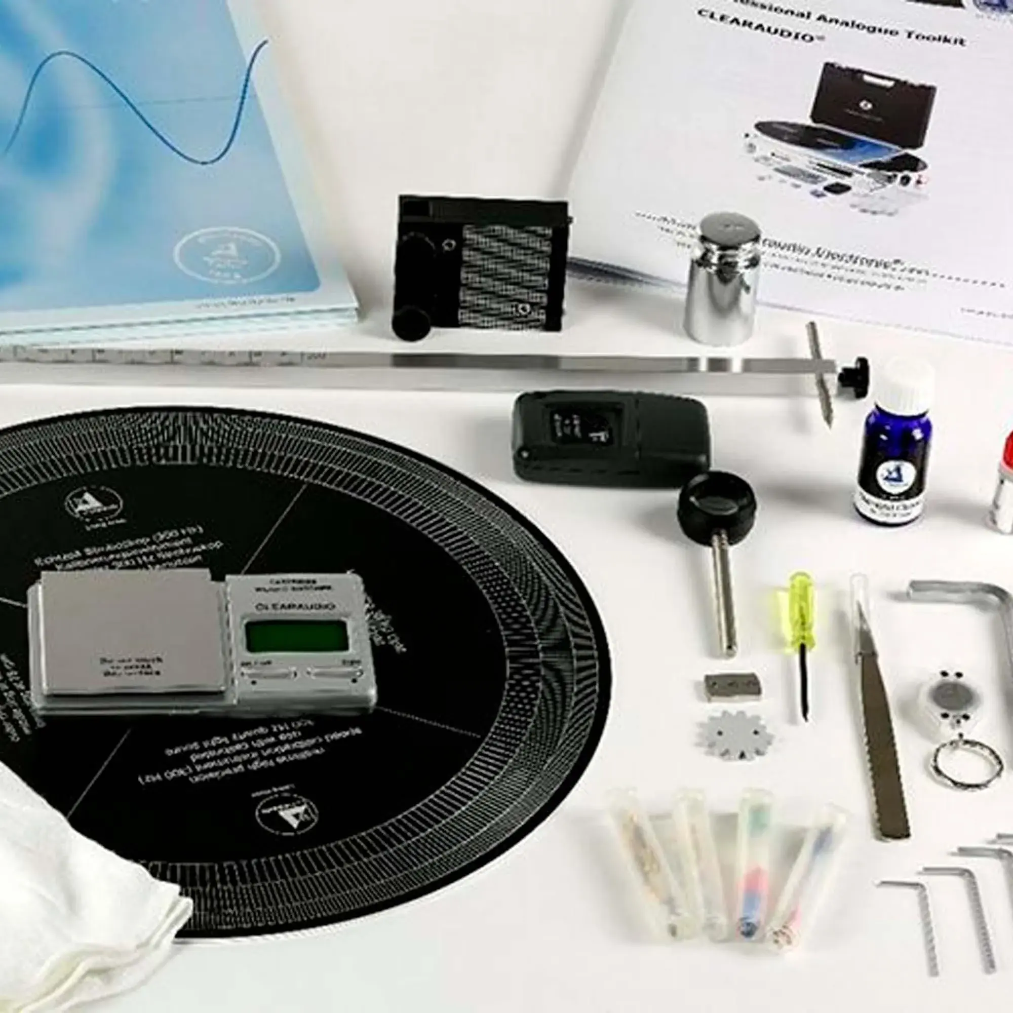 Набор включает в себя такие устройства, как электронные весы с точностью до 0.05 г, высокоточный пузырьковый уровень, жидкость и щеточку для очистки иглы, синтетическое масло для смазки проигрывателя, бесшумный антистатический виниловый мат для пластинок, стробоскопический диск и лампу для точной оценки скорости вращения пластинки, отвертки, ручная дрель для точной настройки глубины резьбы, пинцет, инструмент для настройки тонарма, и другие.
