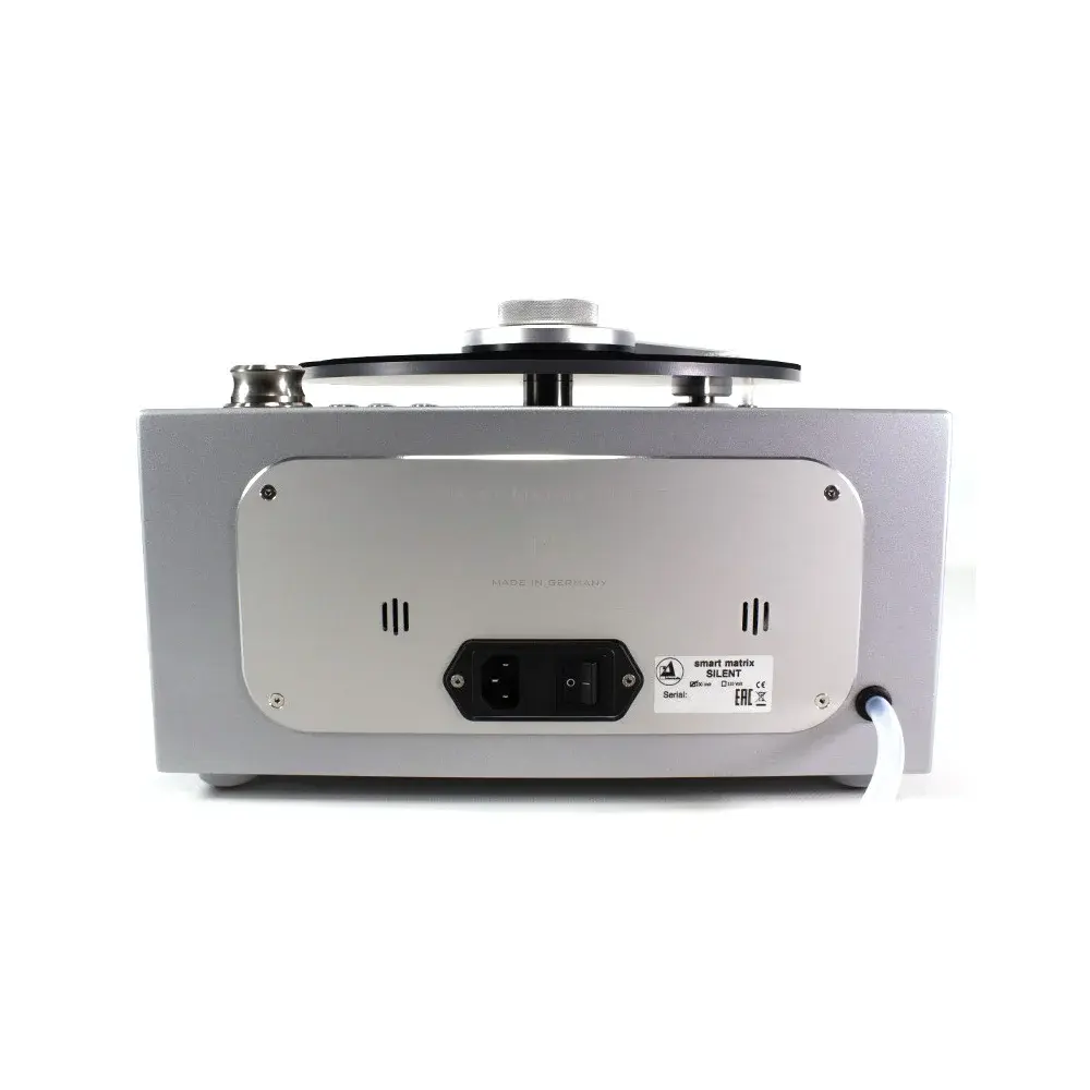 Модель собрана с применением высококачественных компонентов и предназначена для интенсивного продолжительного использования. Жесткое шасси, многофункциональная чистящая головка и фирменный герметичный прижим (клэмп) SMS Seal для защиты лейбла пластинки от попадания влаги изготовлены из алюминия. При этом конструкция Clearaudio Smart Matrix Silent и все входящие в нее механизмы, включая мощный двигатель и вакуумный насос, гарантируют минимальный уровень шума.