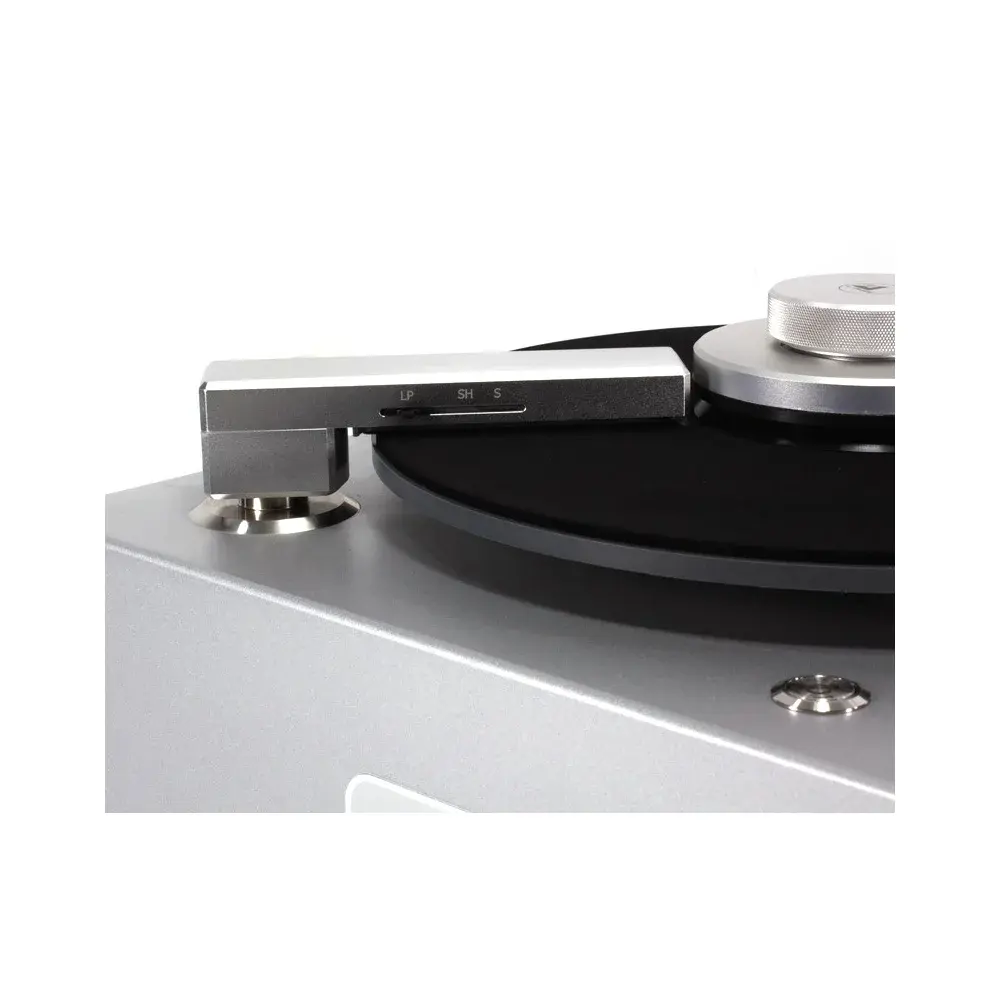 Расположенный прямо на головке «ползунок» позволяет выбрать одно из трех положений (режимов), соответствующее дискам размером в 12, 10 или 7 дюймов. На верхней площадке корпуса находится шпиндель с опорным диском и матом. Там же имеется прикрытая пробкой горловина резервуара (0.4 л) для залива фирменной чистящей жидкости Pure Groove, что удобно делать с помощью входящей в комплект воронки. Для запуска раскручивающего шпиндель двигателя и начала процесса очистки достаточно повернуть и установить головку над уже установленным виниловым или шеллачным диском и слегка нажать на нее.