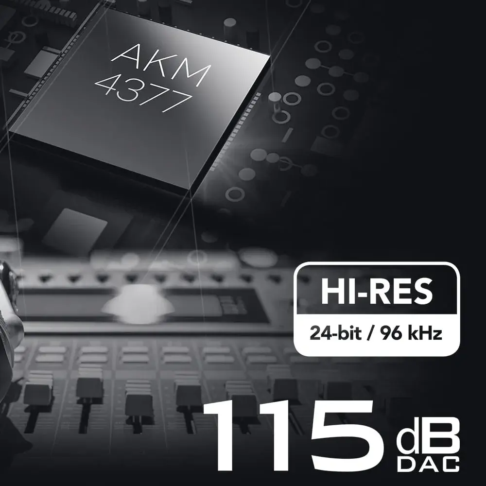 Услышьте каждый слой, каждую деталь и каждый нюанс ваших любимых медиа. Sound Blaster X1 оснащен дополнительным высокоточным 32-разрядным ЦАП AKM, известным в мире аудио своей выдающейся точностью воспроизведения. В сочетании с технологиями AKM, Sound Blaster X1 обеспечивает выдающееся качество звука - до 115 дБ сигнал/шум при разрешении воспроизведения 24 бита / 96 кГц. Это гарантирует безупречное качество звука, демонстрируя лучшее в ваших наушниках и устройстве воспроизведения.