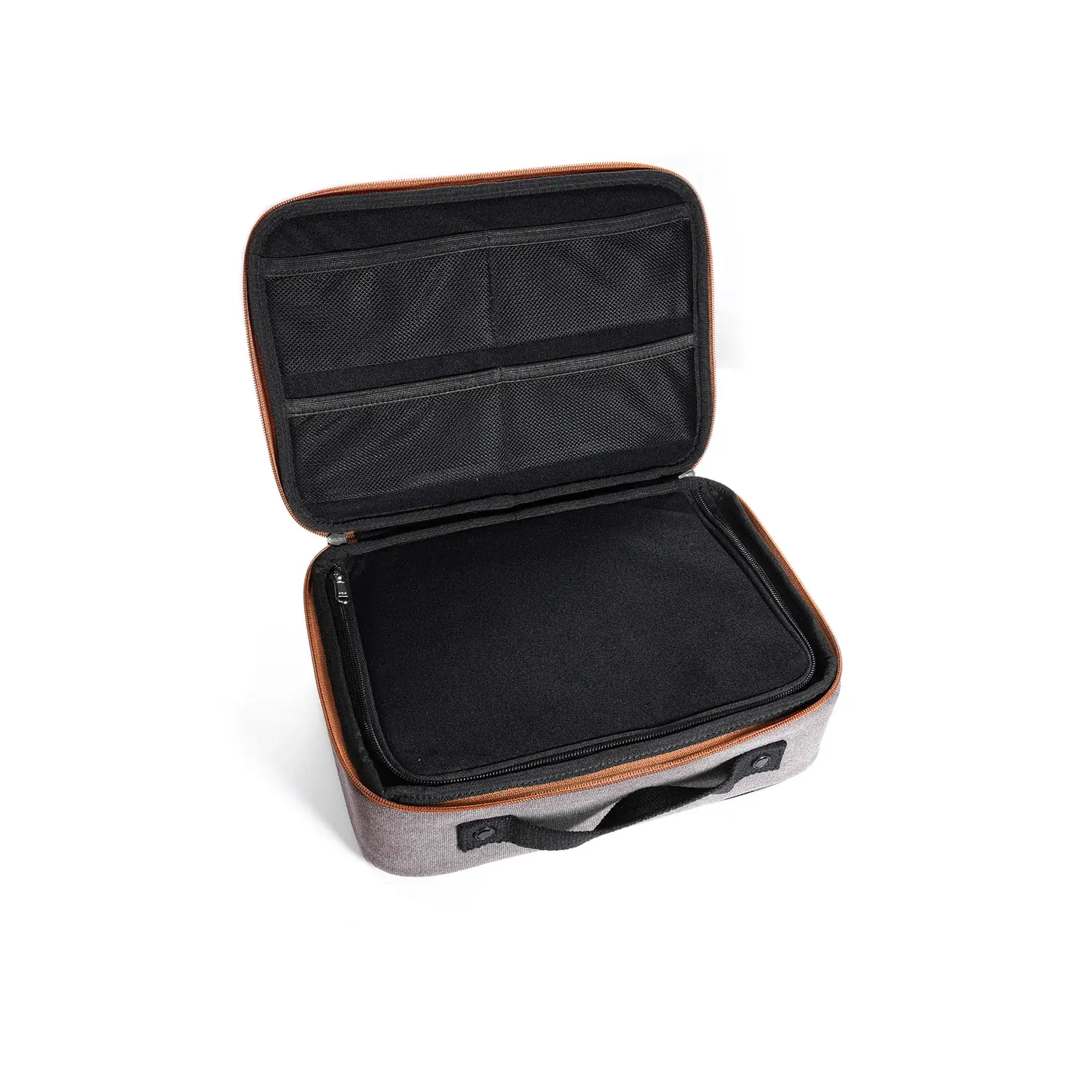В нем есть четыре длинных сетчатых кармана, подходящих для хранения ключей, кабелей для портативных устройств, адаптеров и других аксессуаров. Средний слой заполнен противоударными губчатыми материалами. Верхнюю крышку и нижнюю секцию можно разделить с помощью молнии.