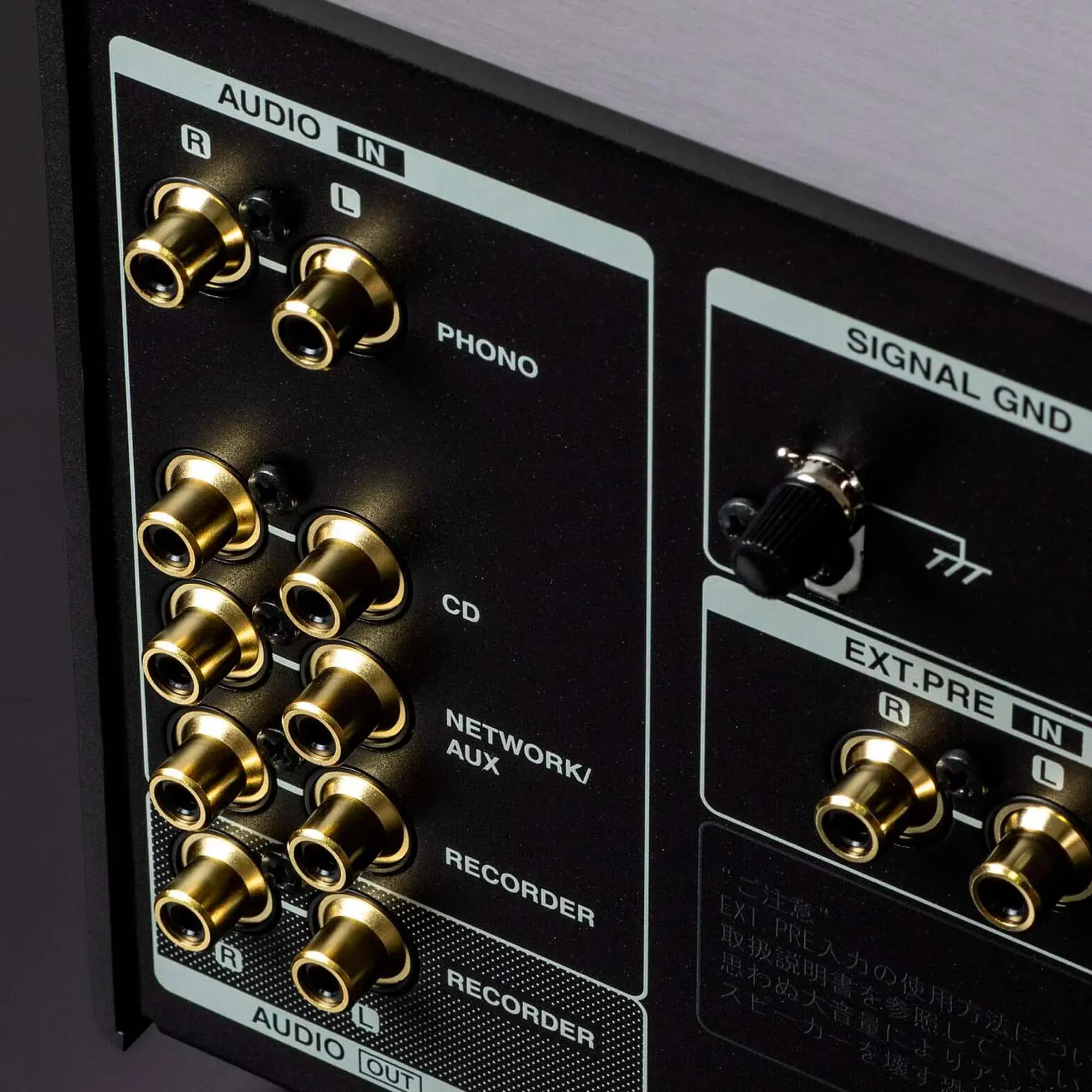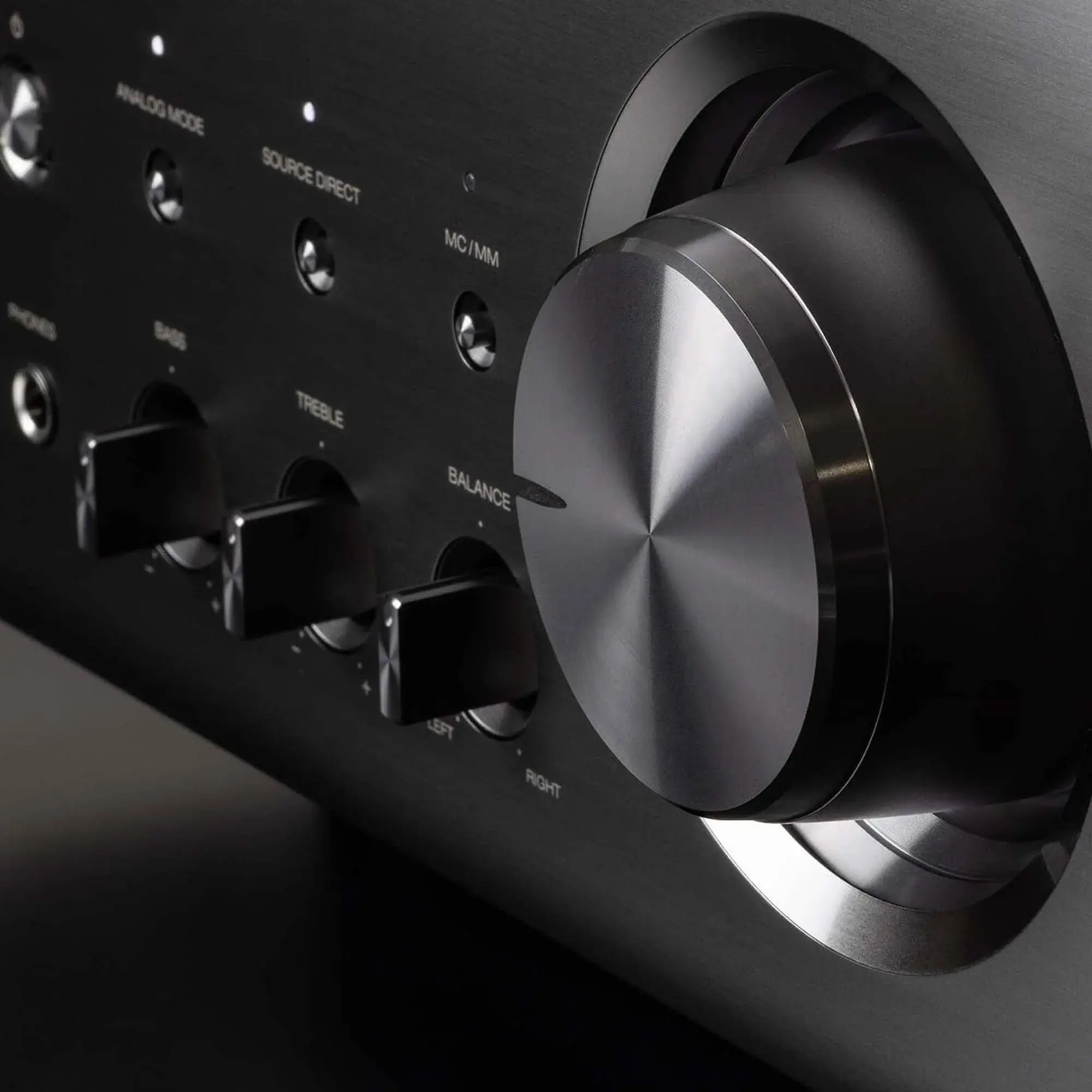 Высокоточное электрическое управление: PMA-A110 оснащён электрическими регуляторами громкости, баланса и тембра, сохраняя при этом аналоговое ощущение работы. Умная инженерия создаёт ощущение аналоговой ручки громкости, в то время как MCU измеряет положение ручки и преобразует это положение для цифрового управления общей громкостью. Этот уникальный механизм обеспечивает более плавное и линейное управление общей громкостью путём регулировки кривой аналогового регулятора громкости в цифровом мире. Та же конфигурация также используется для элементов управления балансом и тоном.