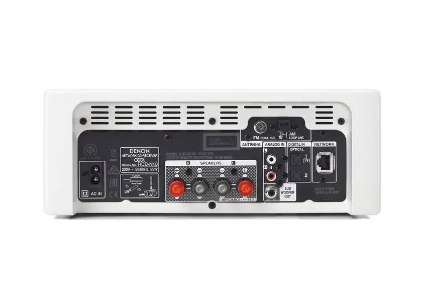 В системе предусмотрена регулировка тембра в области НЧ и ВЧ, один аналоговый и два оптических входа. Для увеличения отдачи на басах к Denon RCD-N10 можно подключить внешний активный сабвуфер. Для любителей слушать музыку в наушниках на передней панели центрального блока системы имеется соответствующий выход.