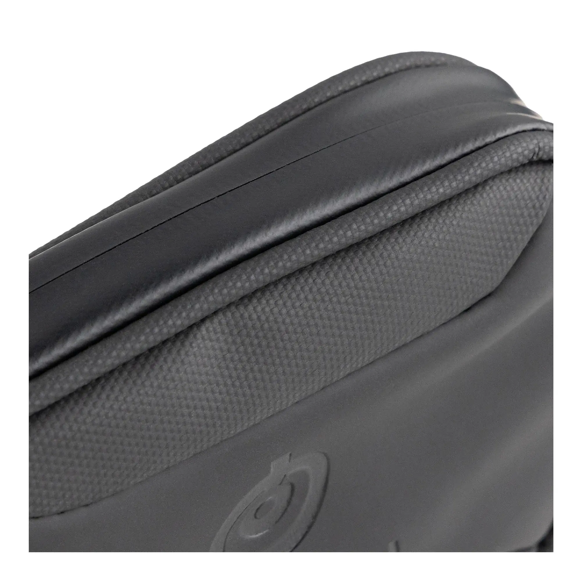 Основной отсек закрывается на водооталкивающую молнию, снаружи сумка выполнена из водонепроницаемой ткани черного цвета на основе ПВХ.