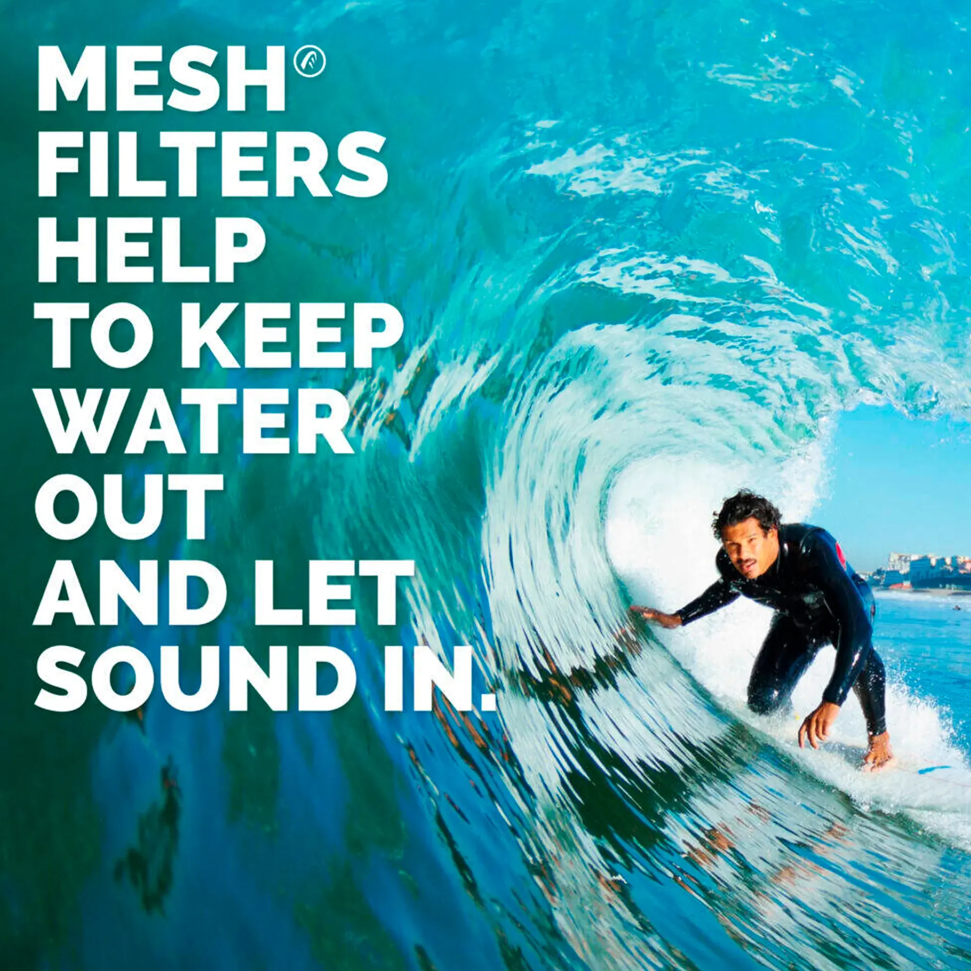 Плавающие беруши Crescendo Swim&Surf специально разработаны для блокировки большей части воды, но не звука, в отличие от решений, которые блокируют весь звук вместе с водой. Эти беруши оснащены фильтрами с усовершенствованной сеткой, которая предотвращает попадание большого количества воды в ушной канал, не препятствуя при этом проникновению звука.