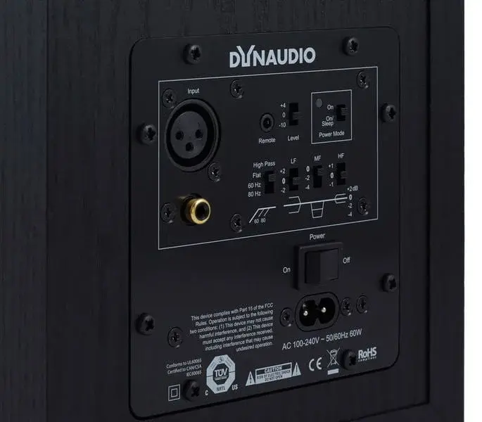 Также на тыловой панели Dynaudio BM5 mkIII можно найти два входа (на XLR и RCA) и четыре переключателя фильтров. LF отвечает за фильтр нижних частот, MF предлагает воспользоваться режекторным фильтром, а HF контролирует уровень верхнего диапазона частот. Наконец, переключатель HIGH PASS является обрезным ВЧ-фильтром, который нужно использовать при подключении сабвуфера. Еще один переключатель LEVEL подстраивает чувствительность монитора к источнику. Реализовано несколько защитных систем, которые предохраняют монитор от перегрева, клиппинга и от помех в сети.